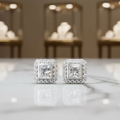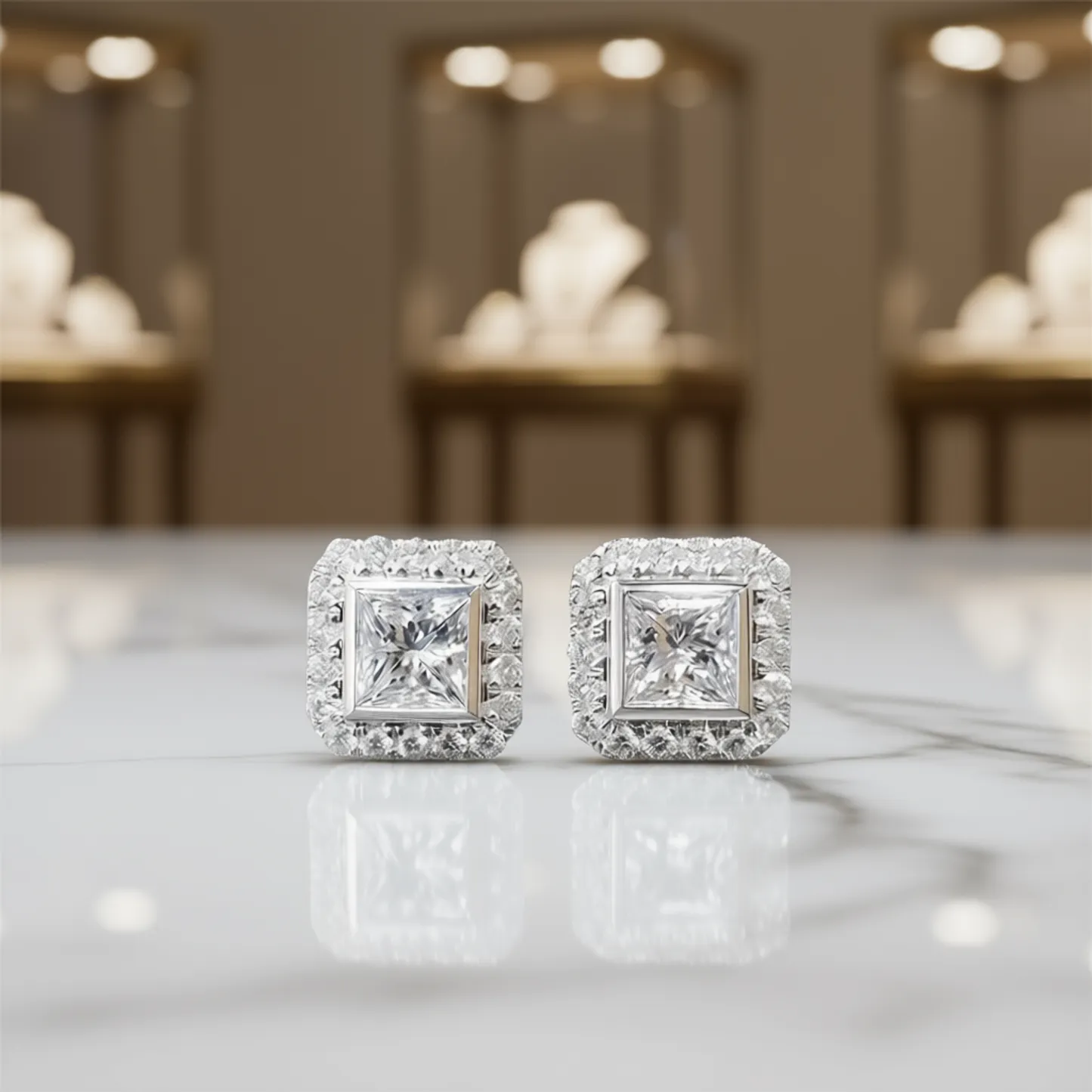 E1708 White Gold Princess Cut Diamond Earrings – D Color, GIA Certified, Classic Wedding Jewelry for Women