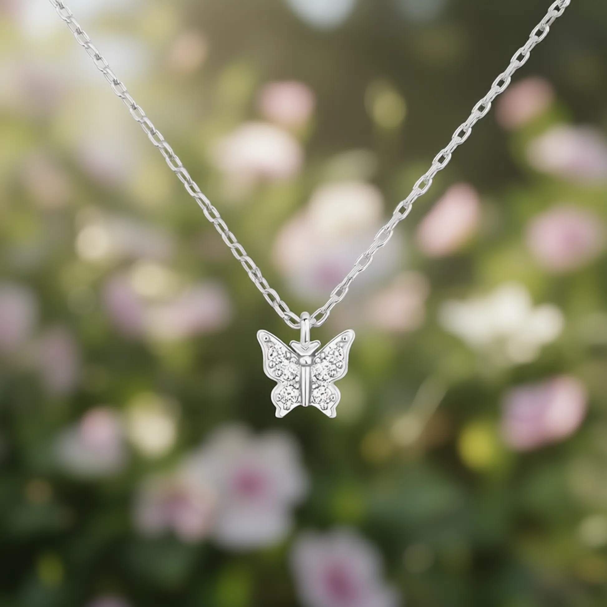 Product Introduction: This delicate butterfly pendant necklace features a charming design crafted from zinc alloy with a silver-plated finish, offering a refined and lustrous appearance. Adorned with round cubic zirconia stones in a pave setting, the butterfly pendant sparkles with subtle brilliance, making it a perfect accessory for daily wear. The necklace is designed to appeal to all genders, combining timeless elegance with modern simplicity. Core Features: Reasons to Choose This Necklace: Silver Plated Butterfly Pendant Necklace with Cubic Zirconia Pave Setting – Elegant Everyday Jewelry for Unisex Wear