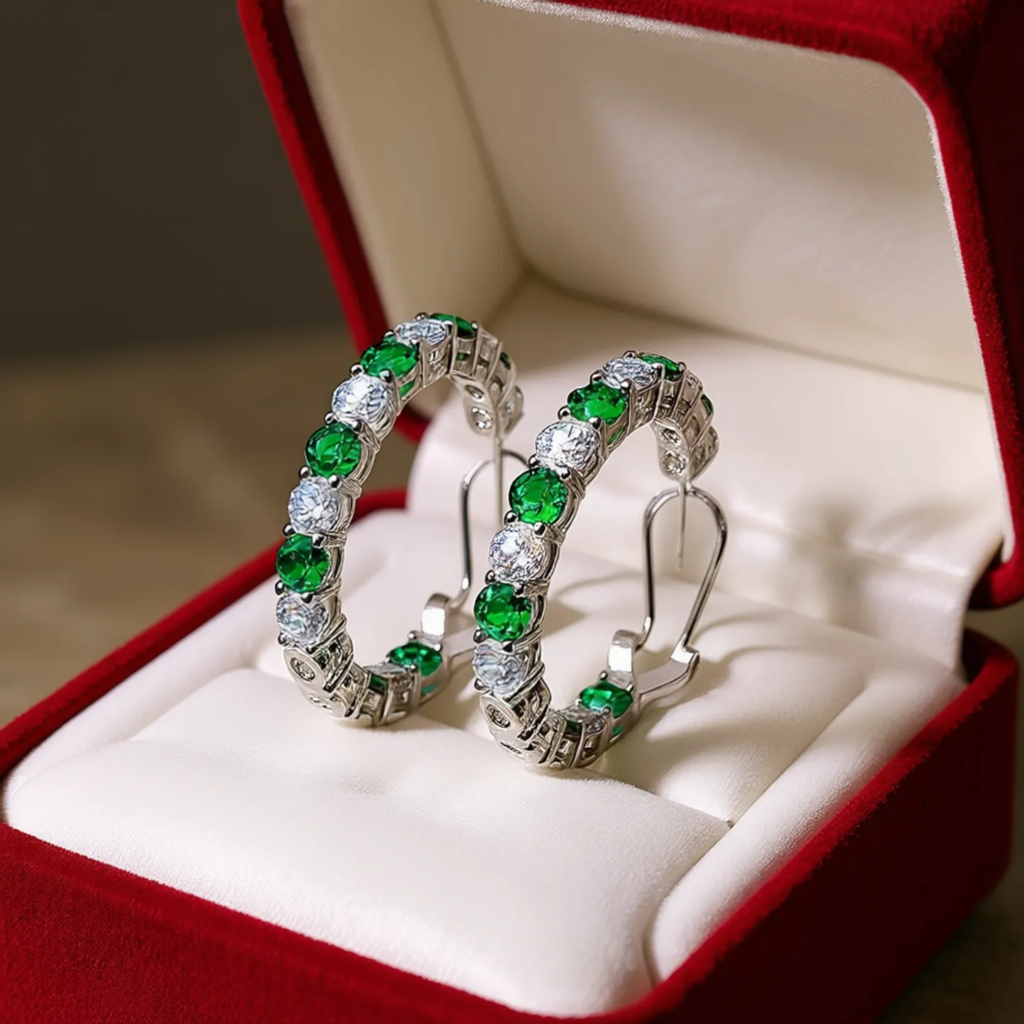 E3213925 Silver Green Gemstone Hoop Earrings – Elegant Everyday Jewelry for Women These exquisite hoop earrings feature a refined design crafted from high-quality925 sterling silver, offering both durability and a luxurious shine. Adorned with vibrant green gemstones and clear crystals, each stone is securely set using a claw-setting technique to ensure stability and brilliance. The alternating arrangement of green gemstones and sparkling crystals creates a balanced, eye-catching aesthetic that complements various styles. Key Features: Why Choose These Earrings?