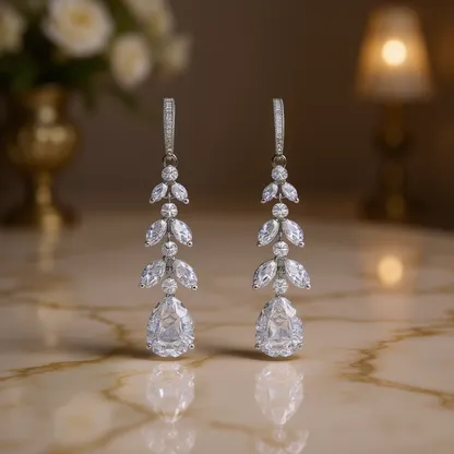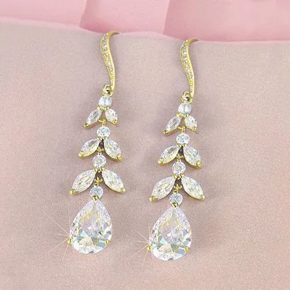 Product Introduction: These elegant E2777 drop earrings feature a luxurious design crafted for women who appreciate refined style. With a water drop shape and a golden plating finish over silver, these earrings showcase a sophisticated blend of modern aesthetics and timeless elegance. The intricate arrangement of crystal rhinestones enhances their sparkle, making them ideal for wedding events or other formal occasions. Core Features: Why Choose These Earrings: Combining elegance with exceptional craftsmanship, these earrings offer a stunning visual appeal that complements any bridal or evening attire. Their lightweight construction ensures comfort during extended wear, while the premium materials guarantee lasting beauty. Ideal for gifting or personal adornment, they represent a thoughtful choice for those seeking luxury-style jewelry.
