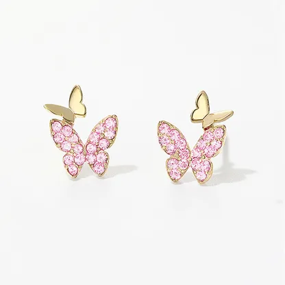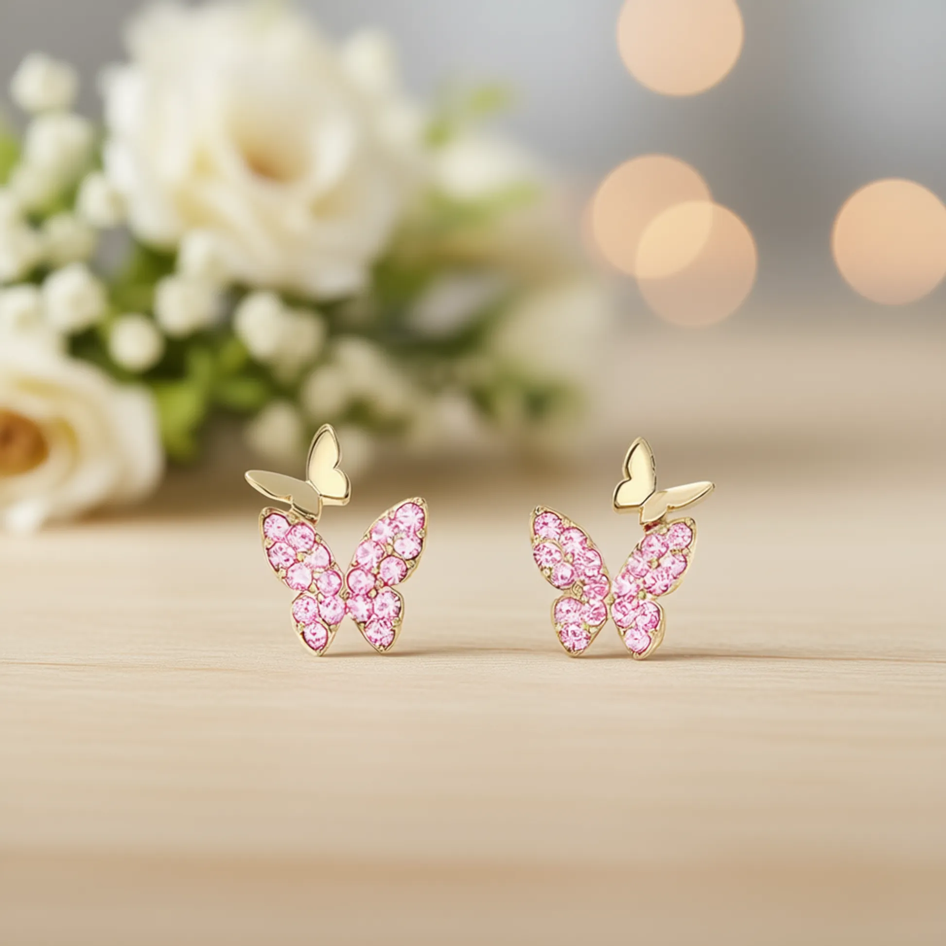 Gold Plated Butterfly Stud Earrings with Pink Rhinestones – Cute Fashion Jewelry for Women