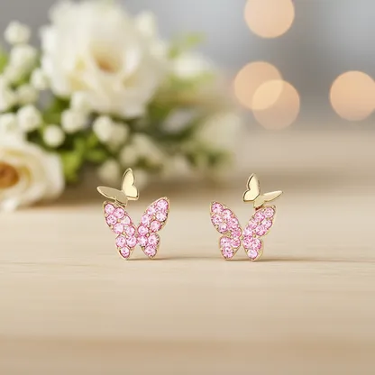 Product Introduction: These elegant gold-plated butterfly stud earrings feature a charming design adorned with sparkling pink rhinestones, making them a delightful addition to any woman's jewelry collection. Crafted from high-quality zinc alloy and finished with a durable gold plating, these earrings combine style, comfort, and lasting appeal. Perfect for everyday wear or as a thoughtful gift, they add a touch of sweetness and sophistication to any outfit. Core Features: Why Choose These Earrings:
