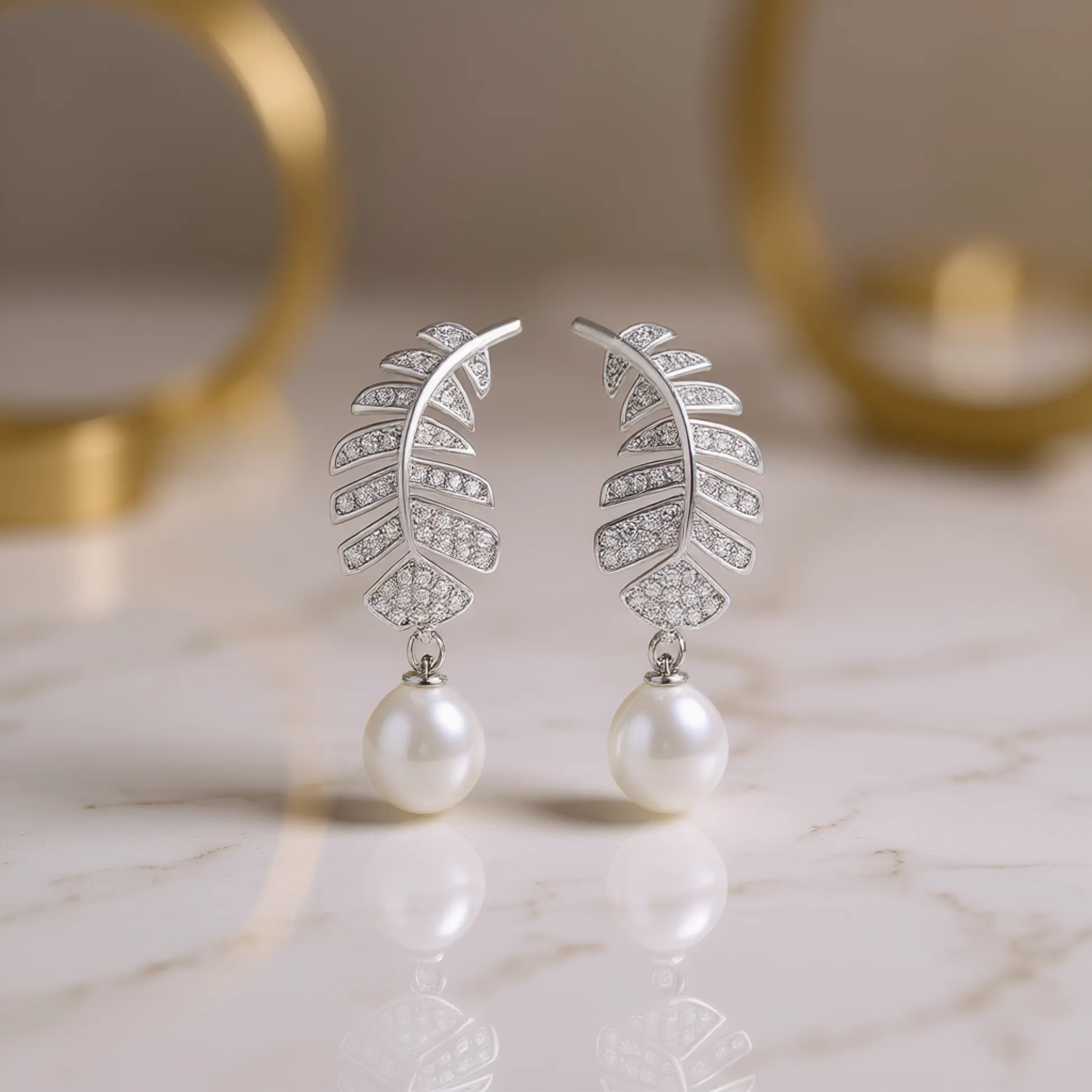 Product Introduction: These elegant drop earrings feature a delicate feather-inspired design, crafted in white gold plating with a romantic and timeless appeal. Perfect for special occasions such as weddings, these earrings combine the natural beauty of imitation pearls with the brilliance of round brilliant cut diamonds set in a pave setting. The design captures light beautifully, offering a subtle sparkle that enhances any formal attire. Core Features: Why Choose This Product: Designed to elevate your look with understated elegance, these earrings are a versatile addition to any jewelry collection. Their lightweight construction ensures comfort during extended wear, while the combination of imitation pearls and sparkling diamonds offers a sophisticated appearance suitable for bridal parties and formal gatherings. Crafted with attention to detail, they reflect a refined sense of style and quality craftsmanship. E1760 White Gold Feather Drop Earrings with Imitation Pearl and Round Brilliant Cut Diamonds