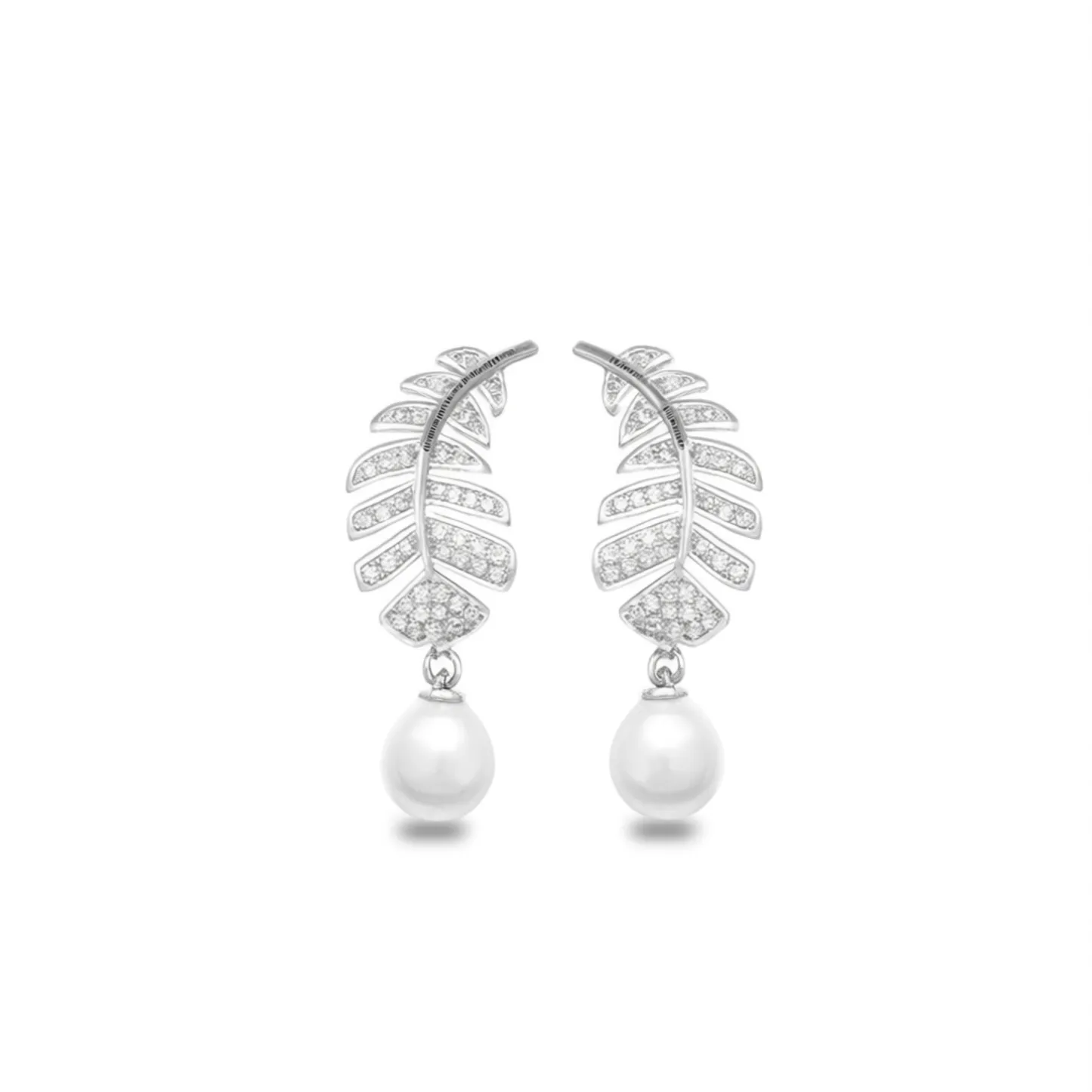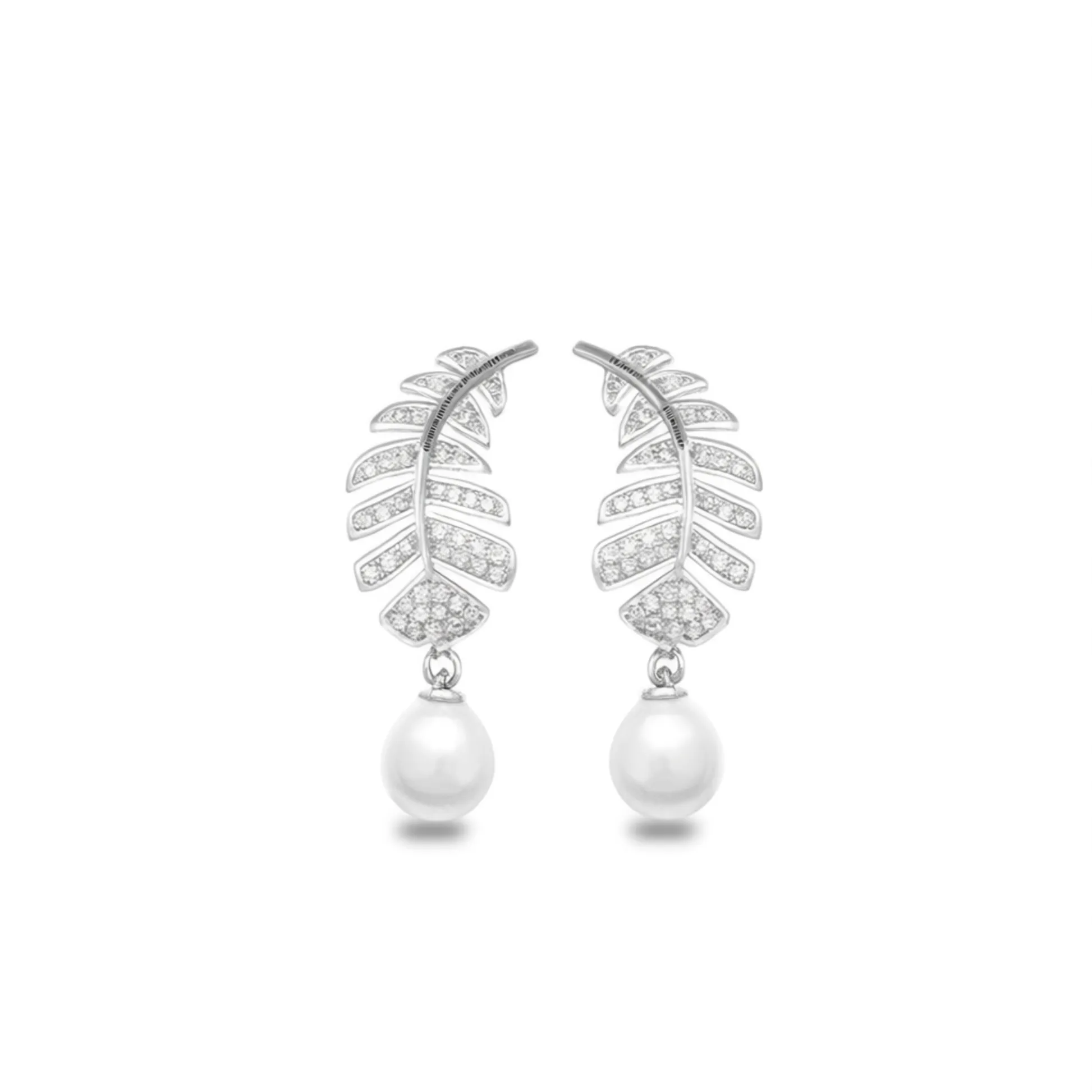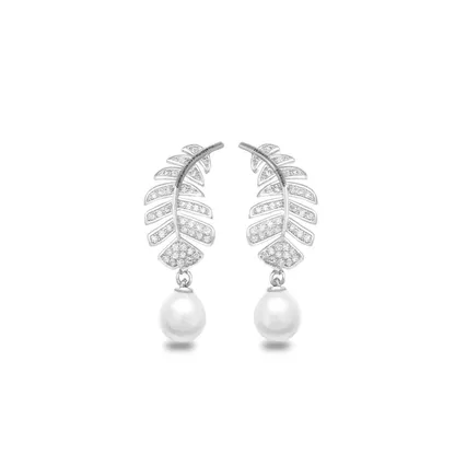 Color White Gold plating White Gold modelnumber E1760 diamondshape Round Brilliant Cut shape\pattern Feather earringstype Drop Earrings occasion Wedding inlaytechnology Pave Setting materialtype Imitation Pearl gender Women's mainstone Pearl jewelrytype Earrings pearltype Imitation Pearl jewelrymainmaterial Alloy style Romantic