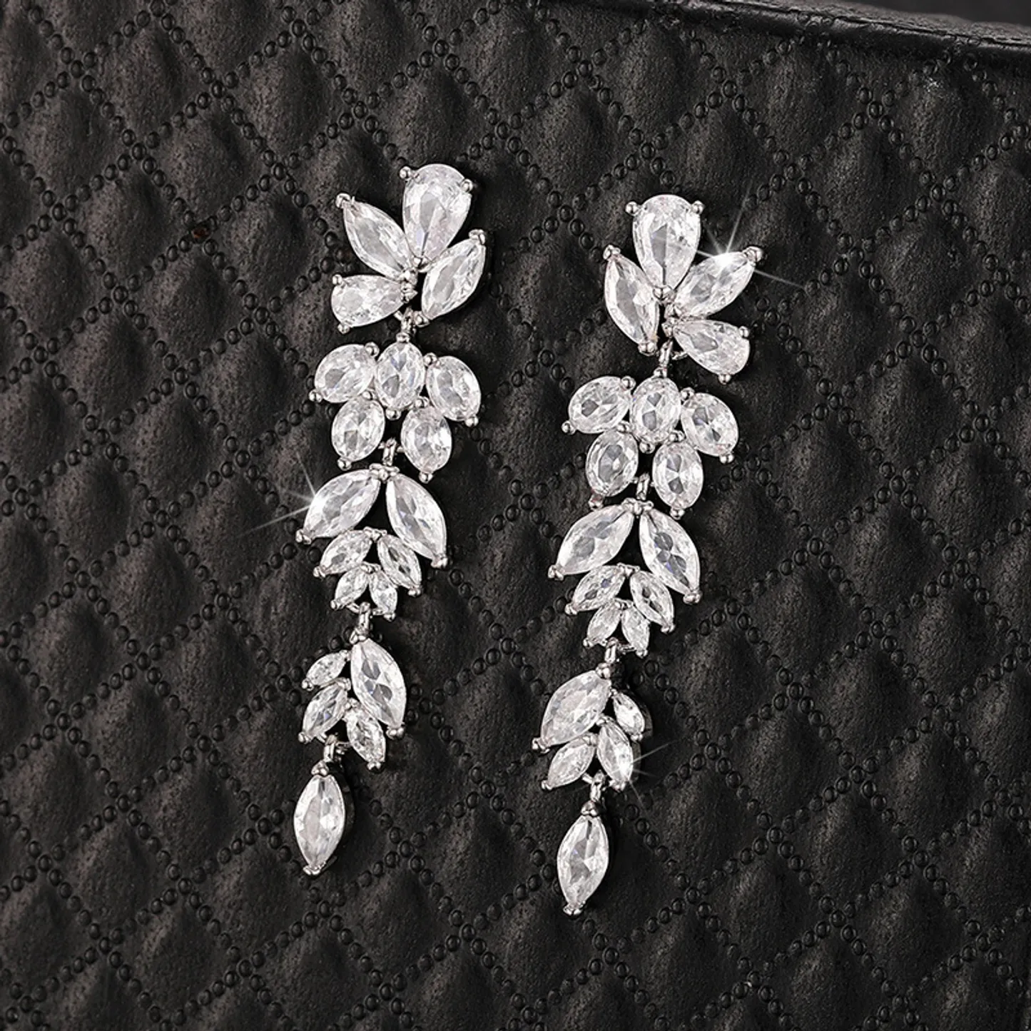 Product Introduction: Elevate your bridal look or everyday elegance with these exquisite White Gold Marquise Cut Crystal Drop Earrings. Designed in a delicate plant-inspired shape, they feature a graceful cascade of marquise-cut crystals meticulously set in a claw setting to enhance brilliance and durability. Perfect for weddings, formal events, or romantic occasions, these earrings combine timeless beauty with modern craftsmanship. Core Features: Why Choose These Earrings: White Gold Marquise Cut Crystal Drop Earrings – Plant Shape Claw Setting for Romantic Wedding & Fashion