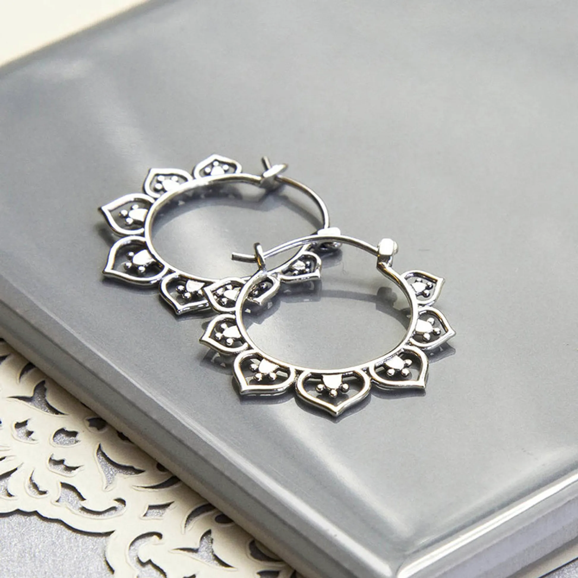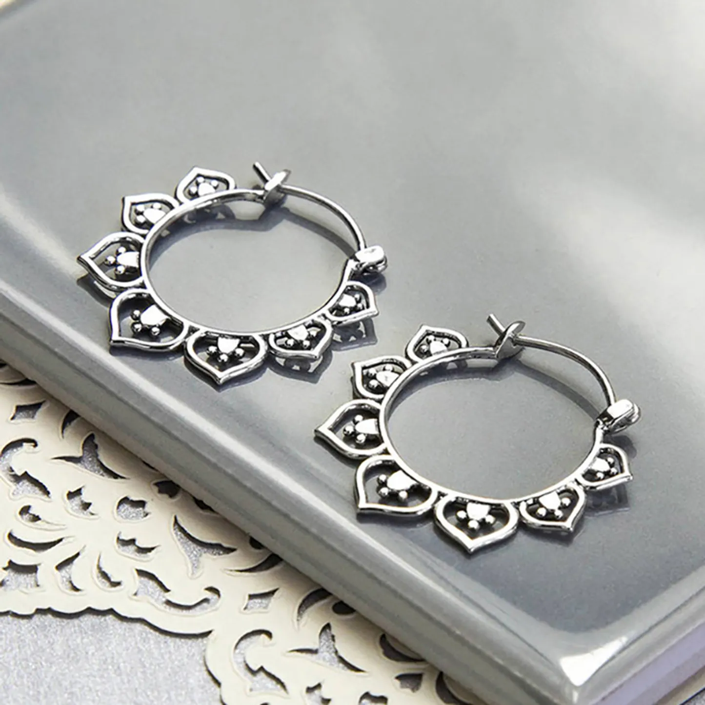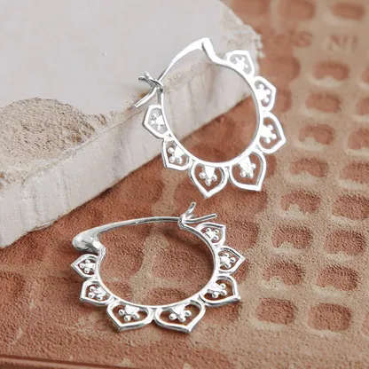 Product Introduction: Elevate your everyday look with these elegant Tibetan Silver Hoop Earrings, crafted in a delicate flower-inspired design. Featuring a bohemian aesthetic, these earrings combine timeless charm with modern fashion sensibility. Perfect for women who appreciate subtle yet distinctive jewelry, they are designed to complement both casual and semi-formal attire. Core Features: Why Choose These Earrings: These Tibetan silver hoop earrings offer a perfect blend of style and affordability. With their detailed craftsmanship and classic silver tone, they make an excellent gift or personal addition to any jewelry collection. Their versatile design allows them to pair effortlessly with different outfits, enhancing your overall look without overpowering it. Tibetan Silver Hoop Earrings – Flower Shape Bohemia Style for Women