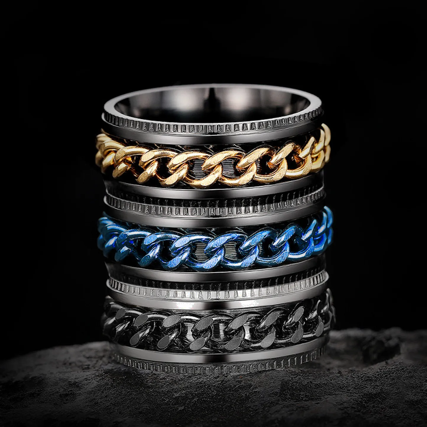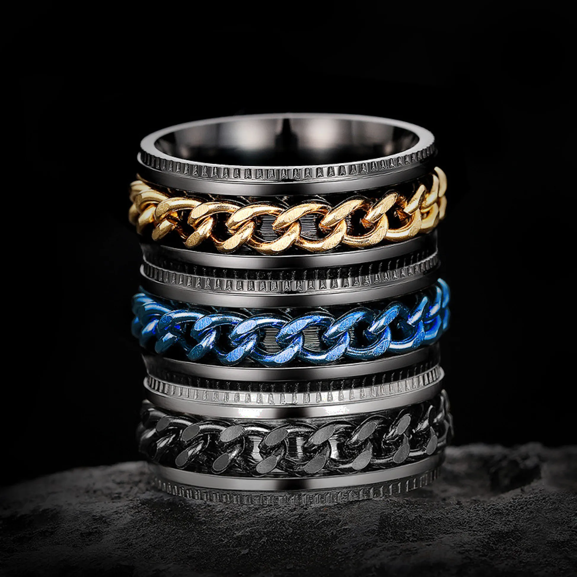 Product Introduction: Discover the perfect blend of style and durability with our DJ062 collection of chain design rings. Crafted with precision, these rings feature a unique woven chain pattern that adds a bold, contemporary touch to any outfit. Available in multiple finishes including silver, gold, black, and blue accents, they cater to diverse fashion preferences. Core Features: Reasons to Buy:DJ062 Fashionable Chain Design Rings