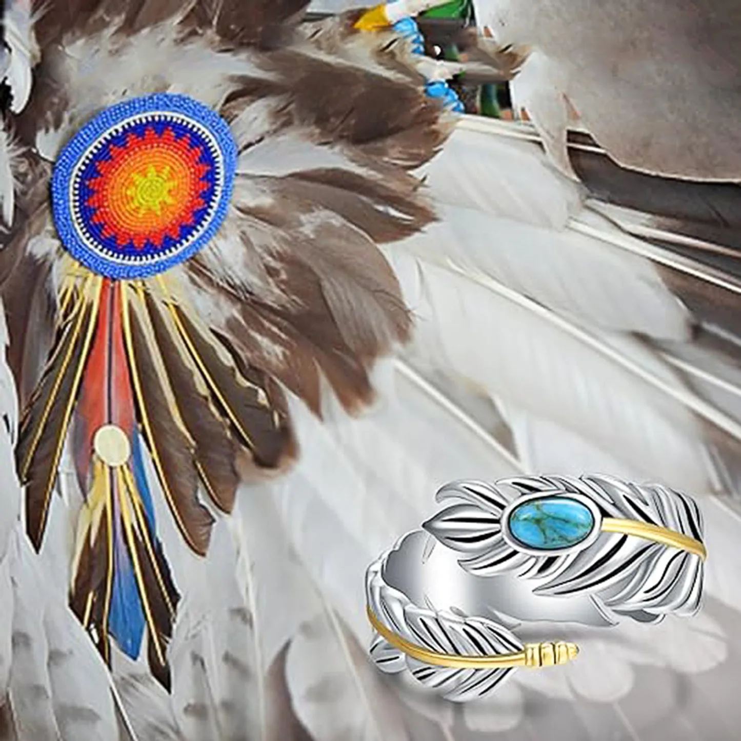 Product Introduction: This elegant T0488 cuff bracelet features a beautifully crafted feather design, combining artistic flair with timeless appeal. Made from high-quality Tibetan silver alloy, it showcases a sophisticated bohemian style enhanced by a striking oval turquoise stone set in a bezel setting. The bracelet is accented with gold-plated details, adding a touch of luxury and contrast to the silver base. Designed for unisex wear, it suits various occasions and makes an ideal gift for loved ones. Core Features: Reasons to Buy:T0488 Feather Cuff Bracelet with Turquoise Stone