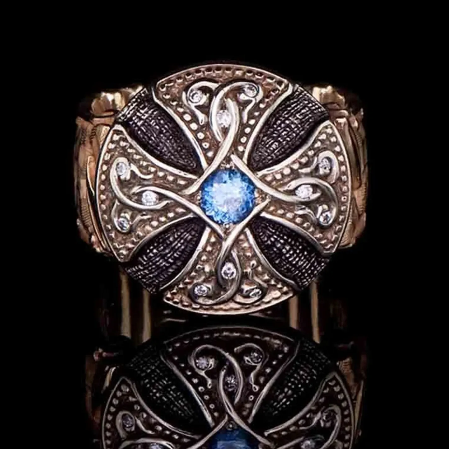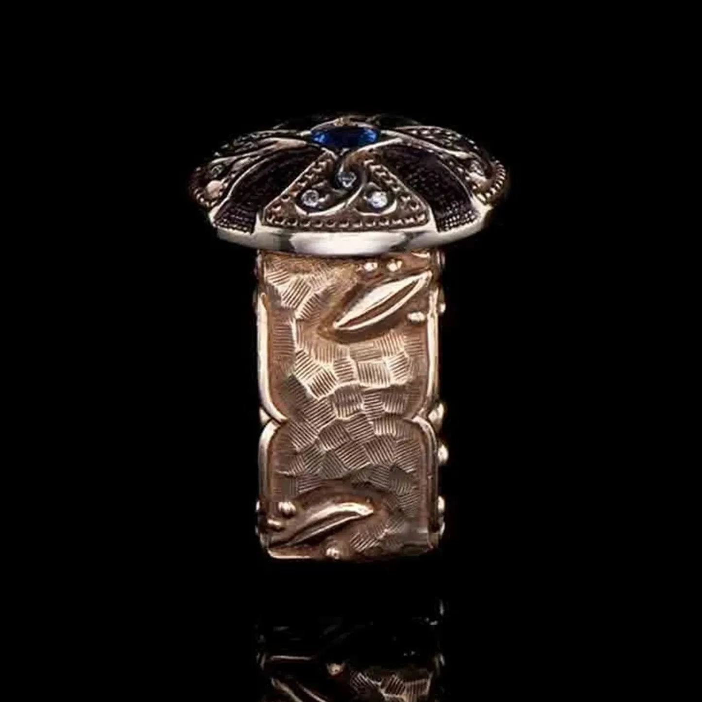 Product Introduction: This exquisite ring, model H145, showcases a stunning blend of traditional craftsmanship and contemporary design. Featuring an intricate floral-inspired pattern with delicate filigree details, it combines elegance with timeless artistry. The centerpiece is a vibrant blue gemstone, surrounded by small accent stones, set within a dual-tone metallic structure that enhances its visual depth. Core Features: Reasons to Purchase: