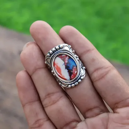 Product Introduction: This elegant ring features a stunning oval cabochon stone set in a finely crafted metal band, showcasing intricate detailing and timeless design. The richly colored gemstone, with its unique marbled pattern of red, white, and blue hues, serves as the centerpiece of this sophisticated piece. Ideal for those who appreciate artisanal jewelry with a touch of vintage charm, this ring combines natural beauty with detailed craftsmanship. Core Features: Reasons to Purchase: