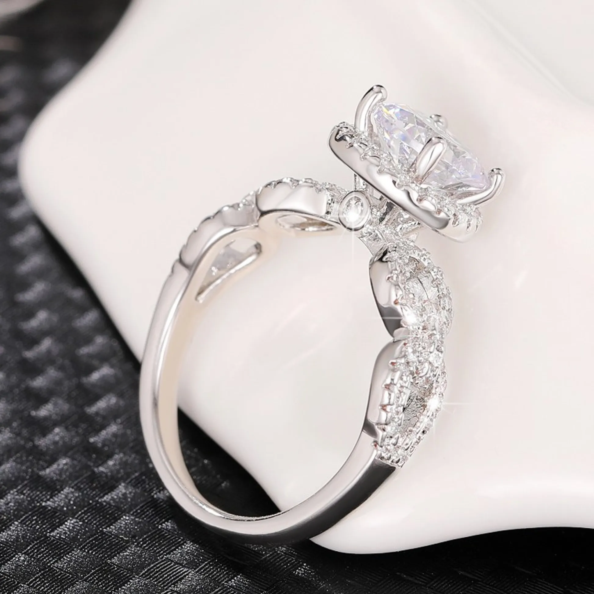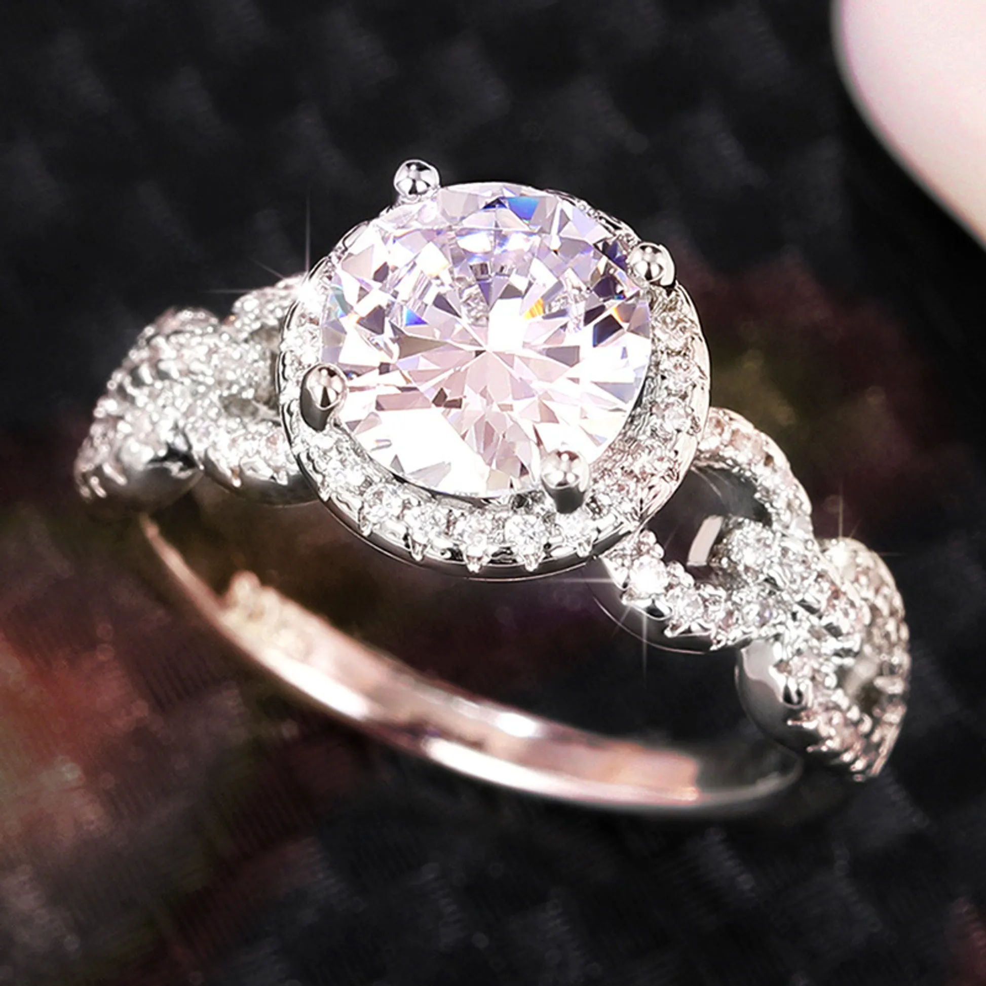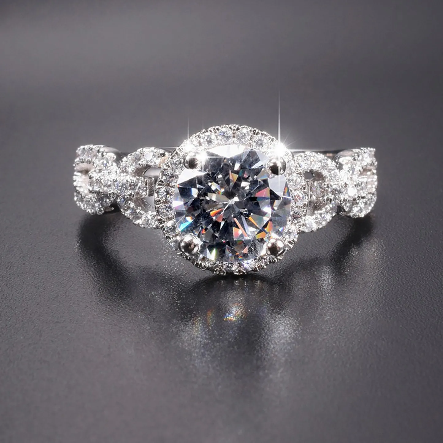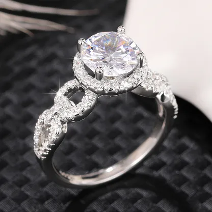 Product Introduction: This elegant ring features a stunning central round-cut gemstone, surrounded by a halo of meticulously set smaller stones that enhance its brilliance. Crafted with precision, the band showcases intricate detailing and a luxurious design, making it a perfect choice for special occasions or as a timeless piece of jewelry. Core Features: Reasons to Purchase: