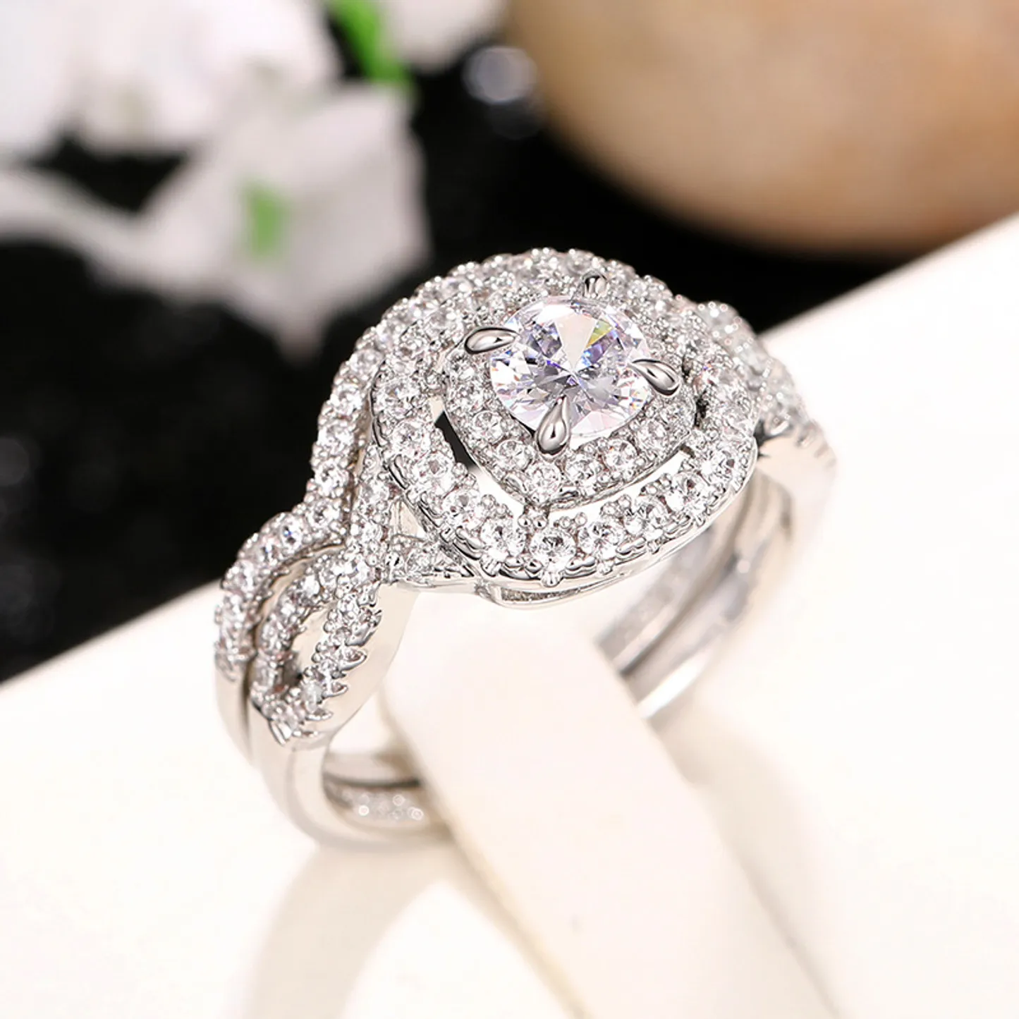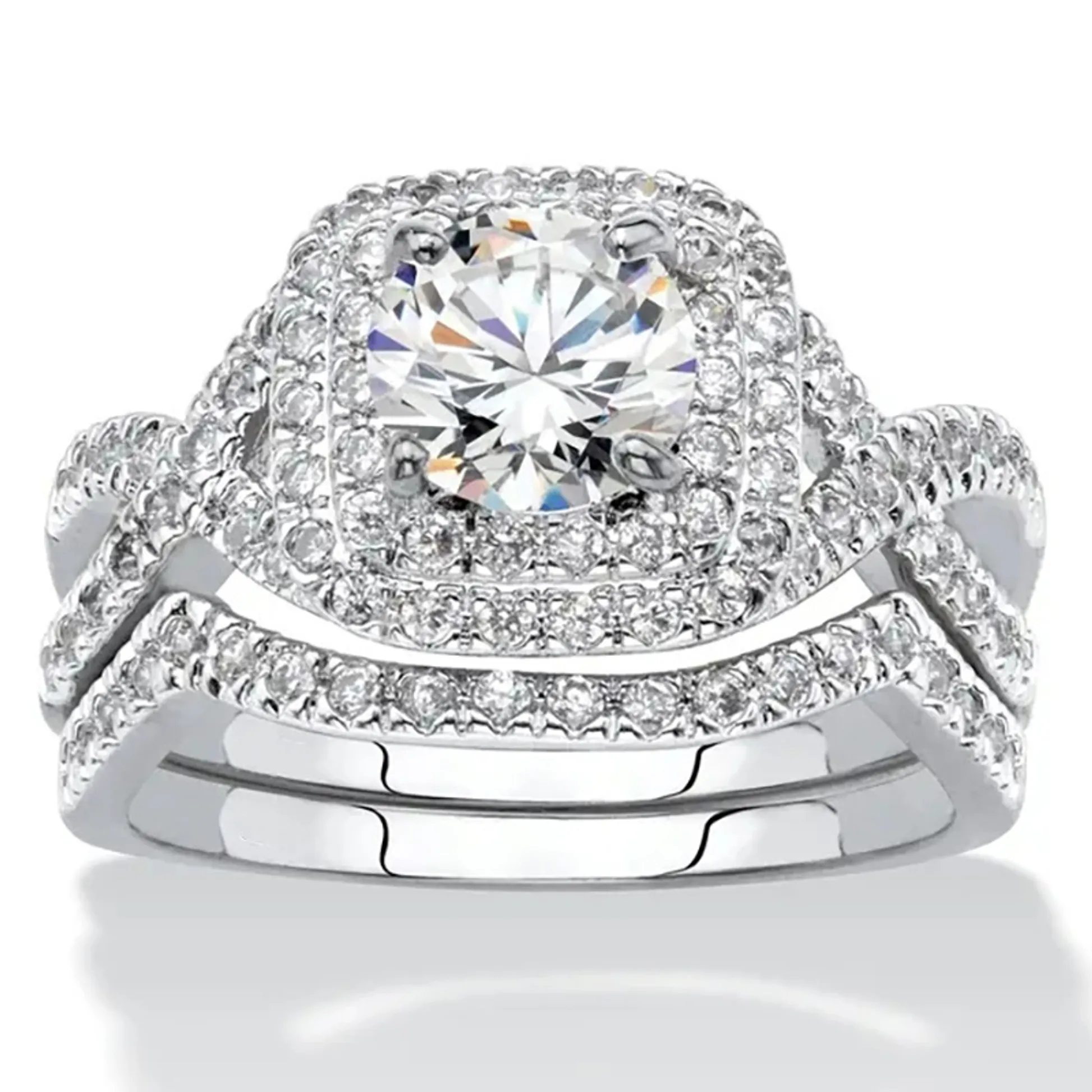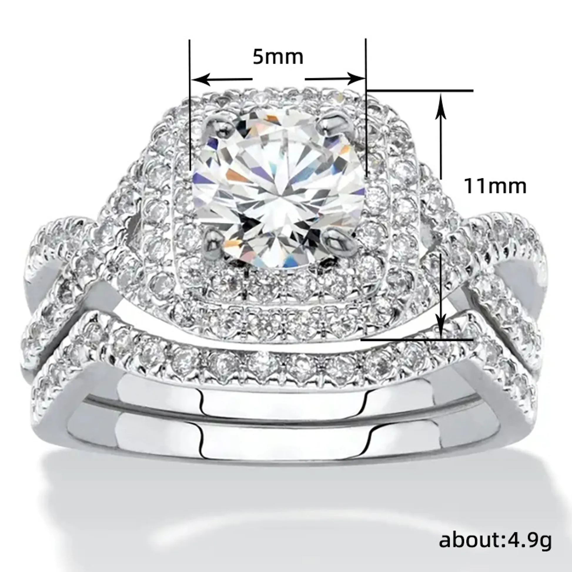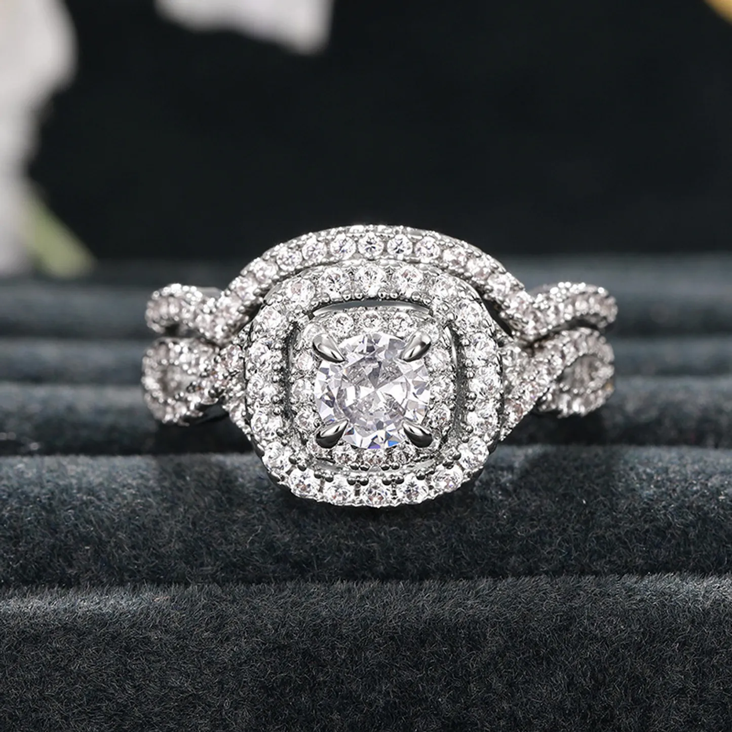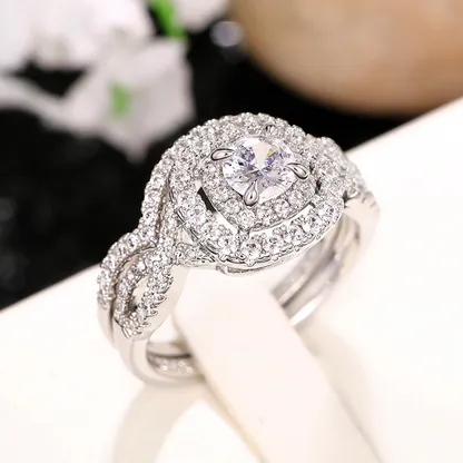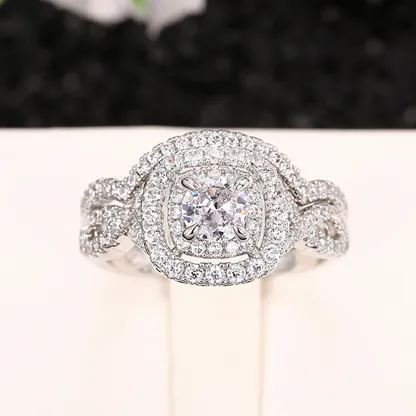 Product Introduction: This elegant engagement ring set features a stunning central round-cut diamond, beautifully framed by a halo of smaller diamonds that enhance its brilliance and sparkle. Crafted with precision, the design showcases a sophisticated double-band style, where both bands are adorned with pavé-set diamonds, creating a continuous shimmering effect. The intricate detailing and refined craftsmanship make this piece a timeless choice for those seeking a luxurious and romantic statement. Core Features: Reasons to Purchase: