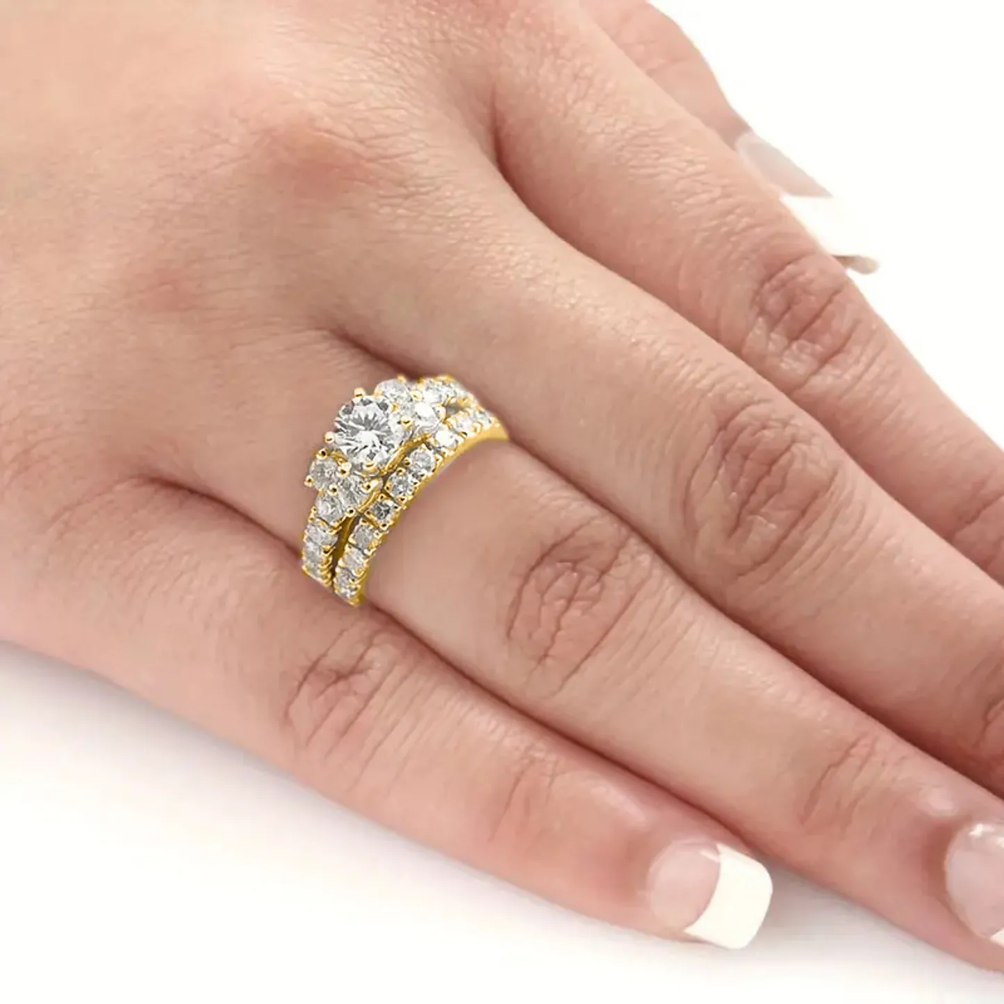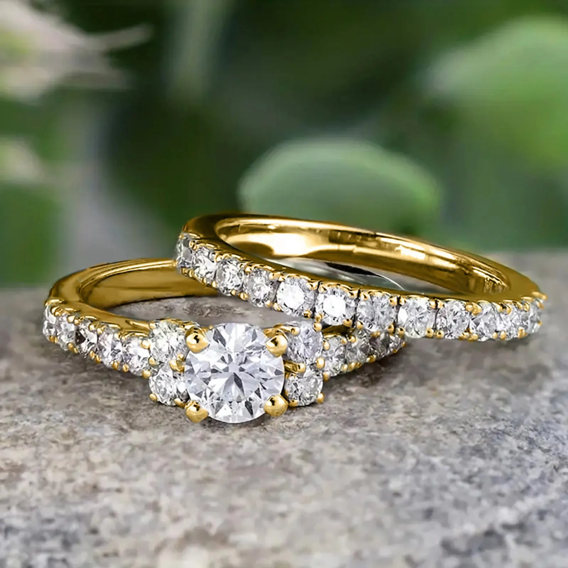 Elegant Diamond Engagement and Wedding Ring Set – Timeless Beauty for Your Special Moment This exquisite ring set features a classic three-stone engagement ring with a central round brilliant-cut diamond, flanked by two smaller accent stones, all securely held in a prong setting. The band is adorned with a delicate row of pavé-set diamonds, creating a shimmering effect that enhances its sophistication. Crafted from high-quality sterling silver or white gold-plated metal, the rings offer lasting durability and a lustrous finish. Key Features: Why Choose This Ring Set:
