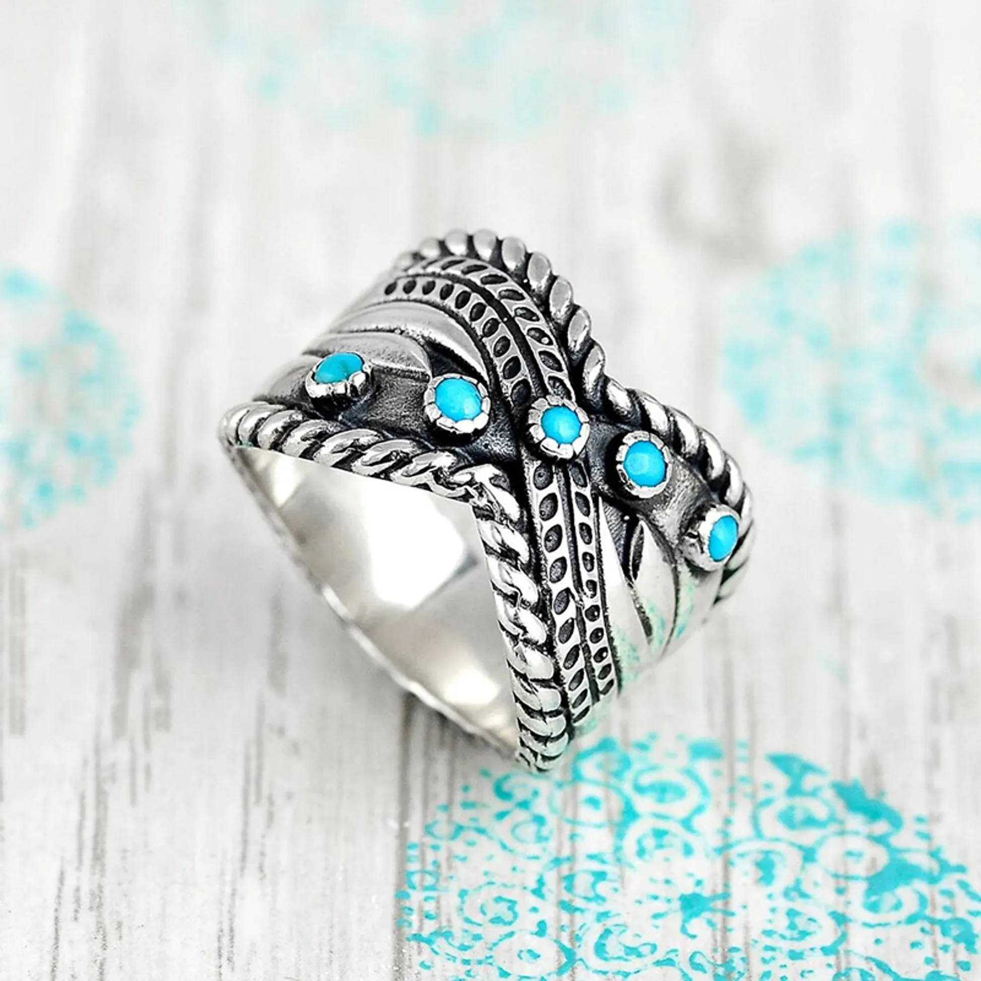 Product Introduction: This A083 ring features an intricately designed, vintage-inspired aesthetic with a twisted band pattern and embedded turquoise stones. Crafted in a silver-tone metal finish, it combines timeless elegance with bold ethnic flair, making it a versatile accessory for various styles. Core Features: Reasons to Purchase:A083 Turquoise Stone Ring – Vintage-Inspired Silver-Tone Jewelry
