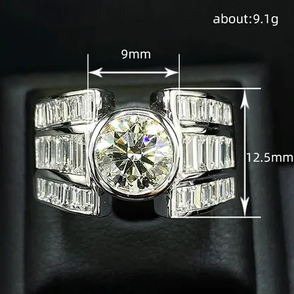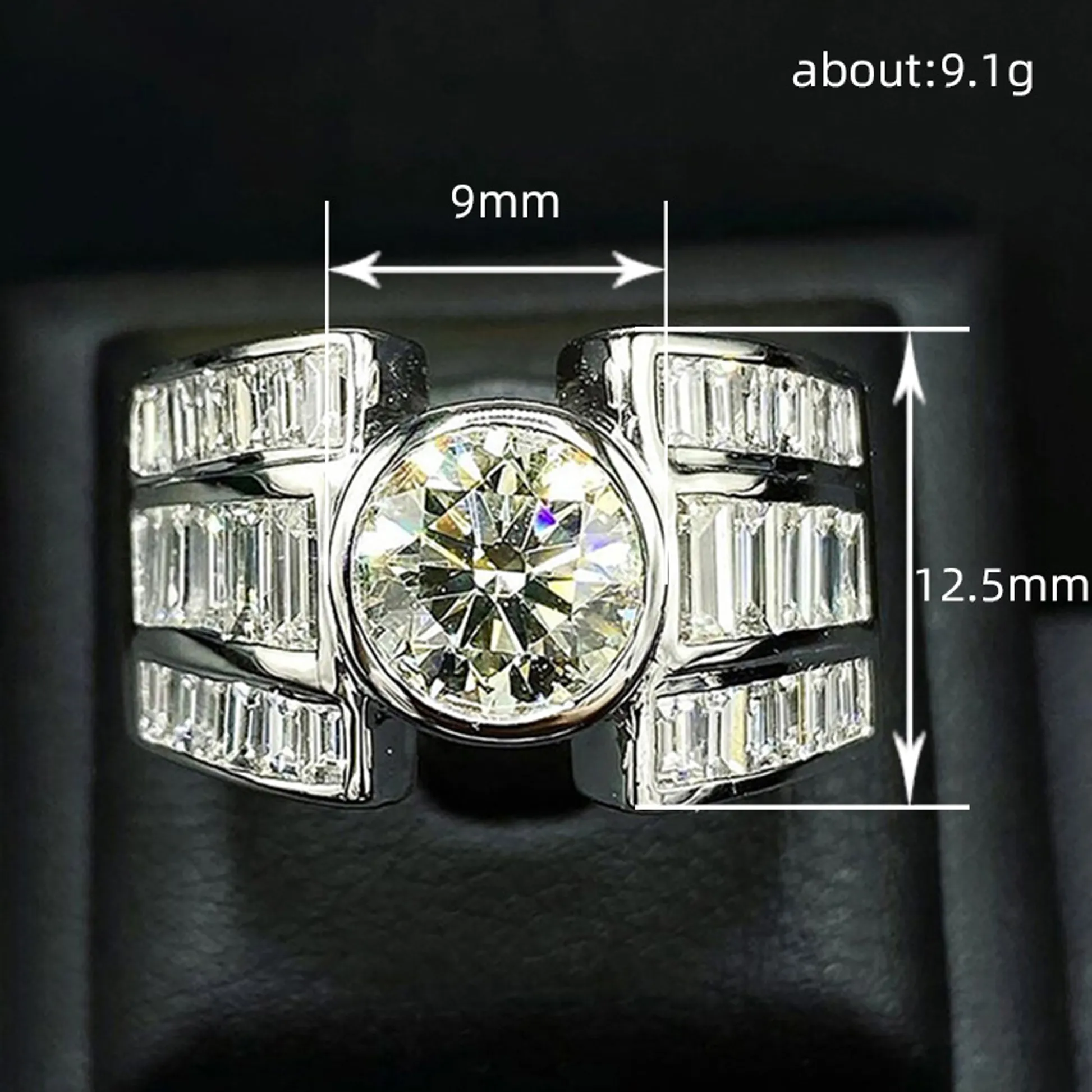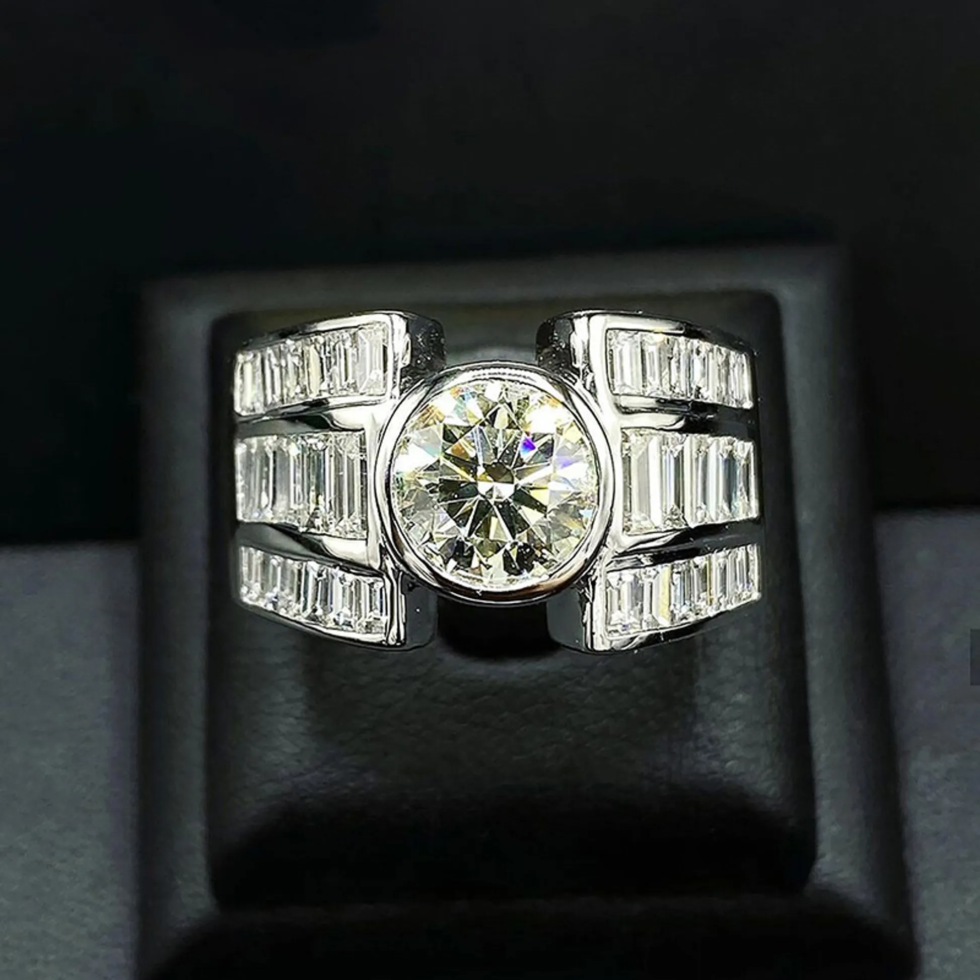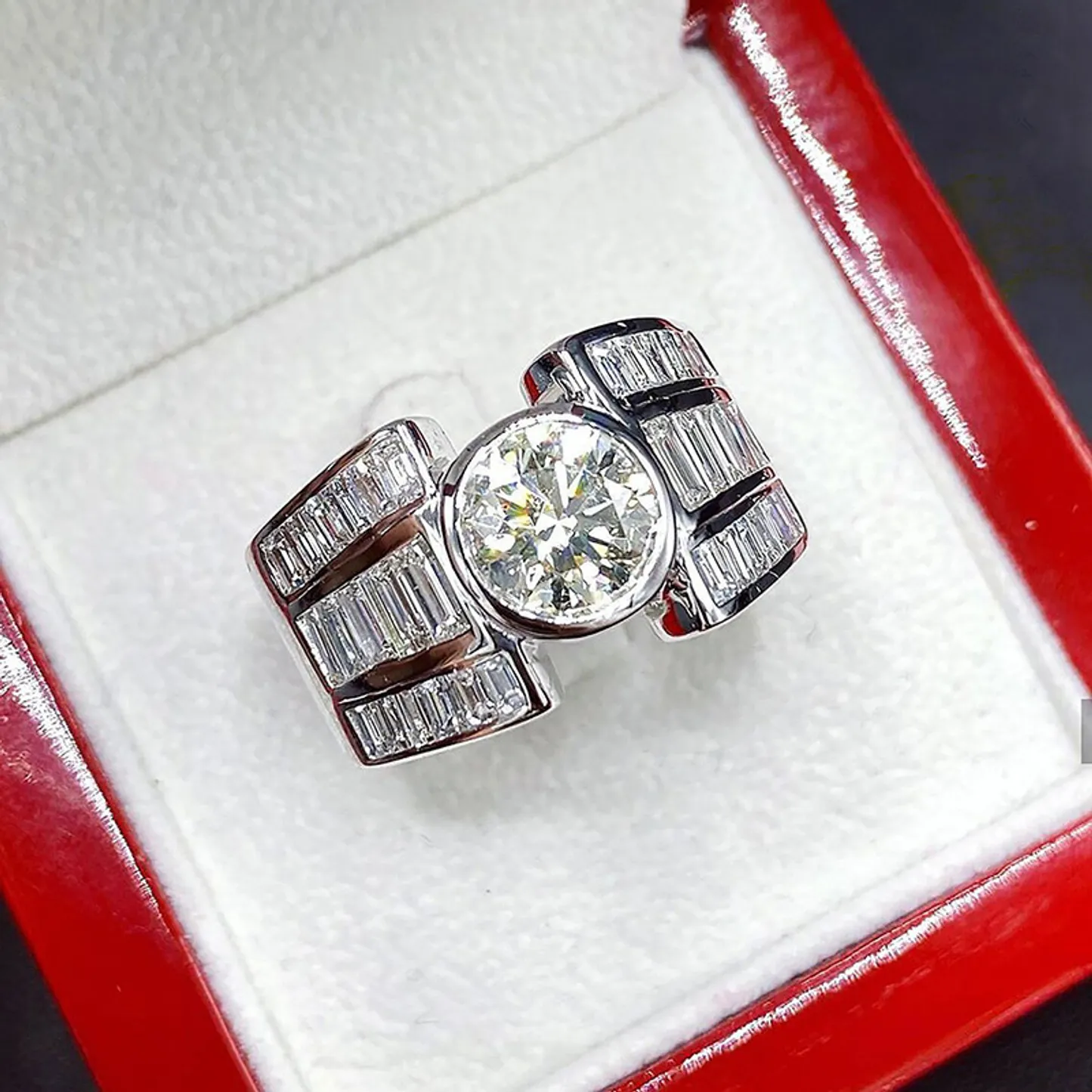 Product Introduction: This elegant ring features a stunning central round-cut gemstone, surrounded by a sophisticated arrangement of baguette-cut side stones. Crafted with precision, the design showcases a bold and modern aesthetic, ideal for those who appreciate timeless elegance with a contemporary twist. Core Features: Reasons to Buy: