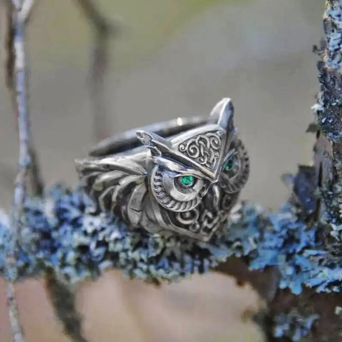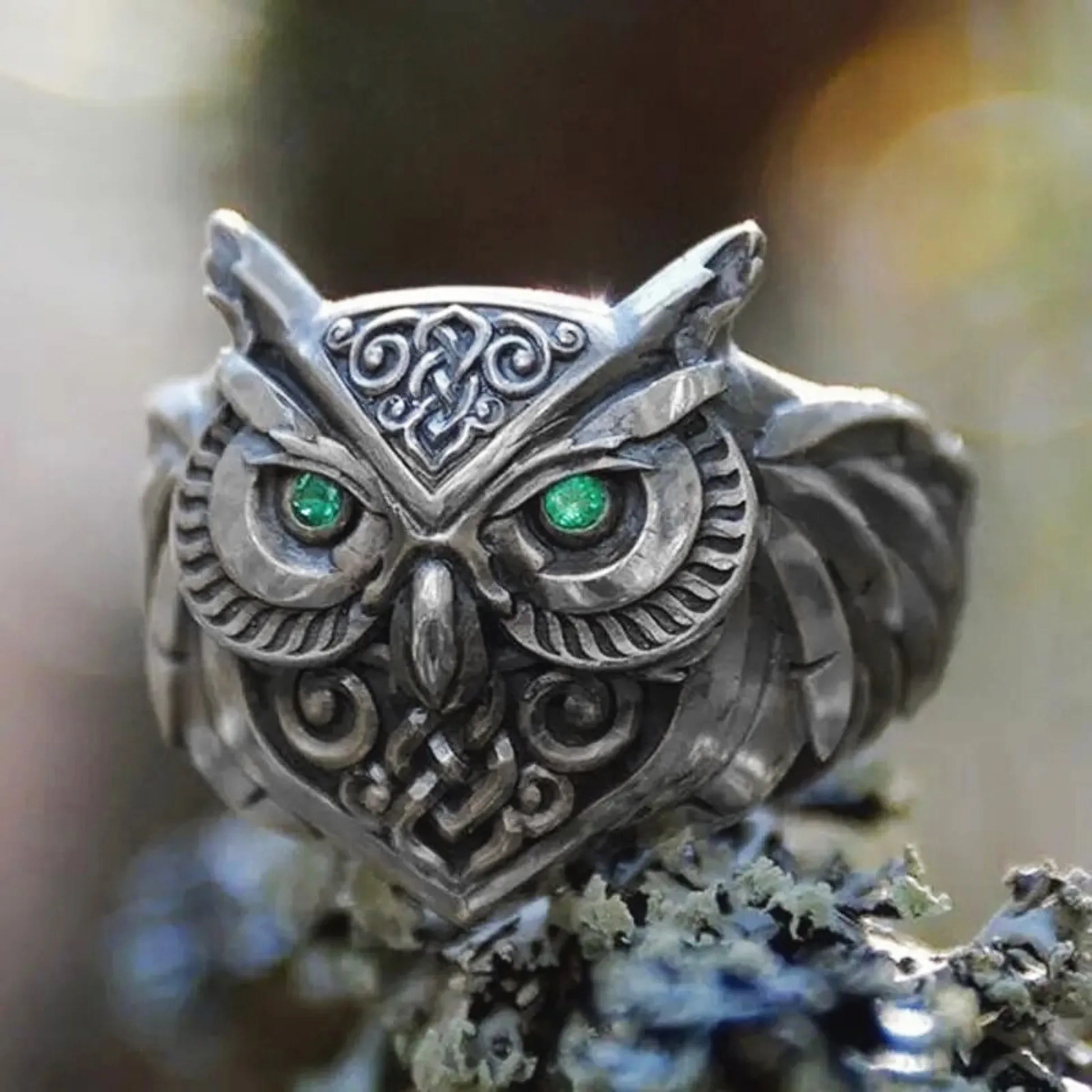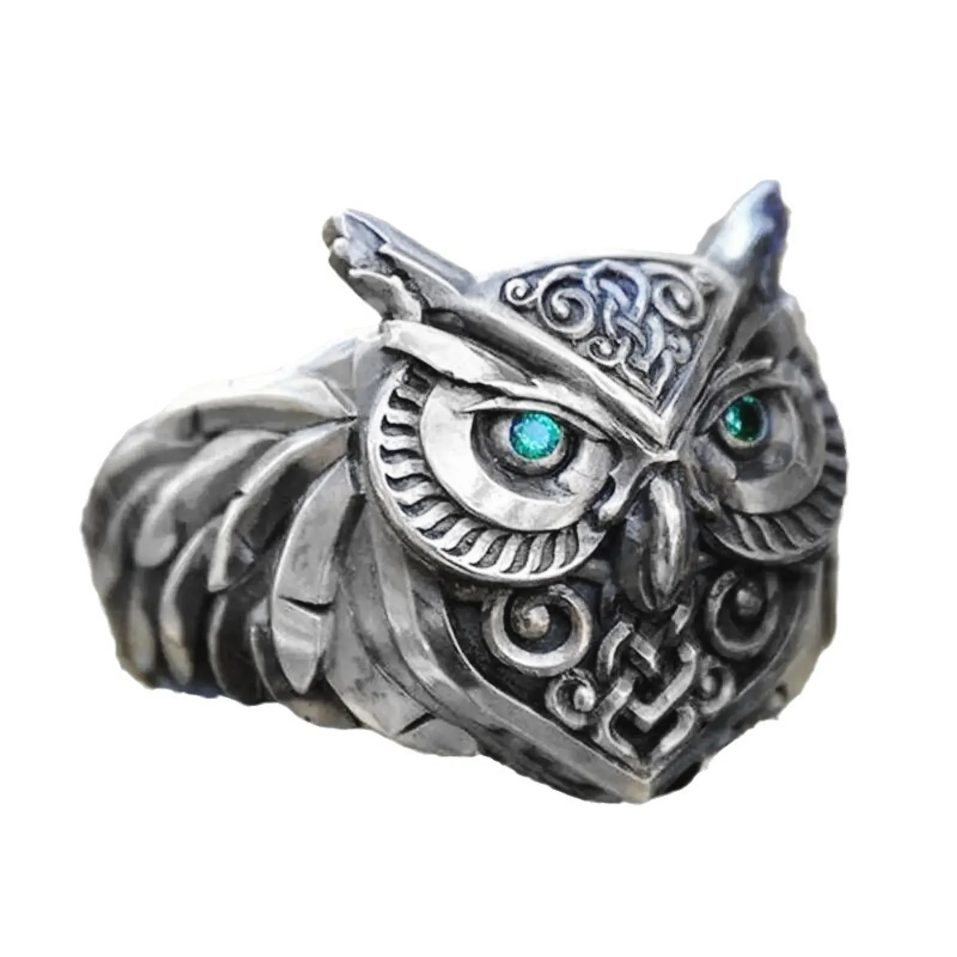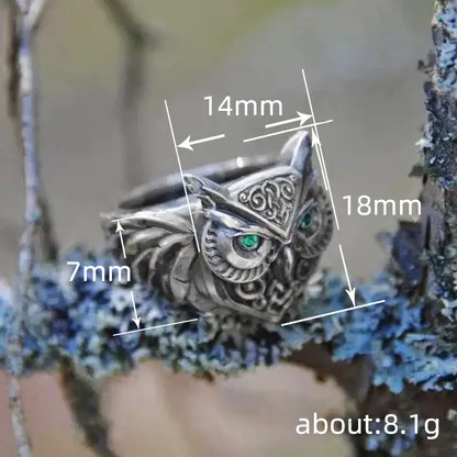 Product Introduction: This intricately designed owl-themed ring showcases a unique blend of artistry and craftsmanship, making it a striking piece of wearable jewelry. Crafted with detailed metalwork, the ring features an owl motif with expressive eyes highlighted by vibrant turquoise gemstones, symbolizing wisdom and insight. The design incorporates ornate patterns and textured feathers, adding depth and character to the overall aesthetic. Core Features: Reasons to Purchase: