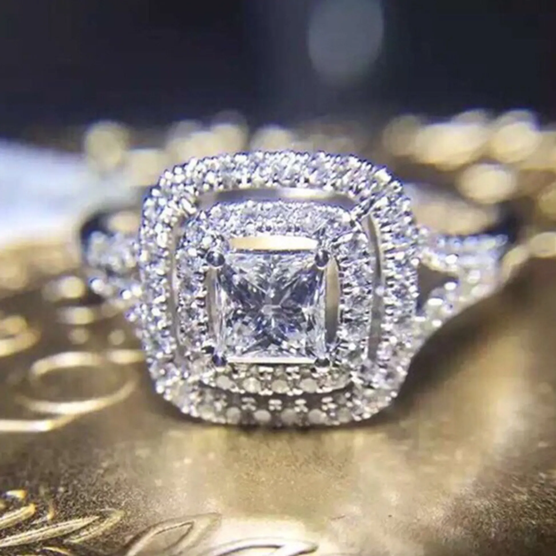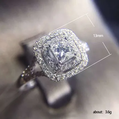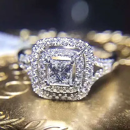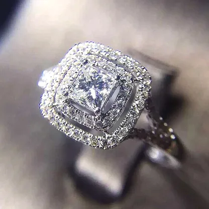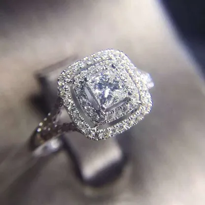 Product Introduction: This exquisite F961 diamond ring features a stunning princess-cut center stone, elegantly framed by a double halo of pavé-set diamonds. Crafted with precision, the ring showcases a sophisticated design that combines timeless beauty with modern craftsmanship. Ideal for engagement or special occasions, it symbolizes enduring elegance and refined taste. Core Features: Reasons to Purchase:F961 - Elegant Diamond Ring with Prong Setting and Halo Design