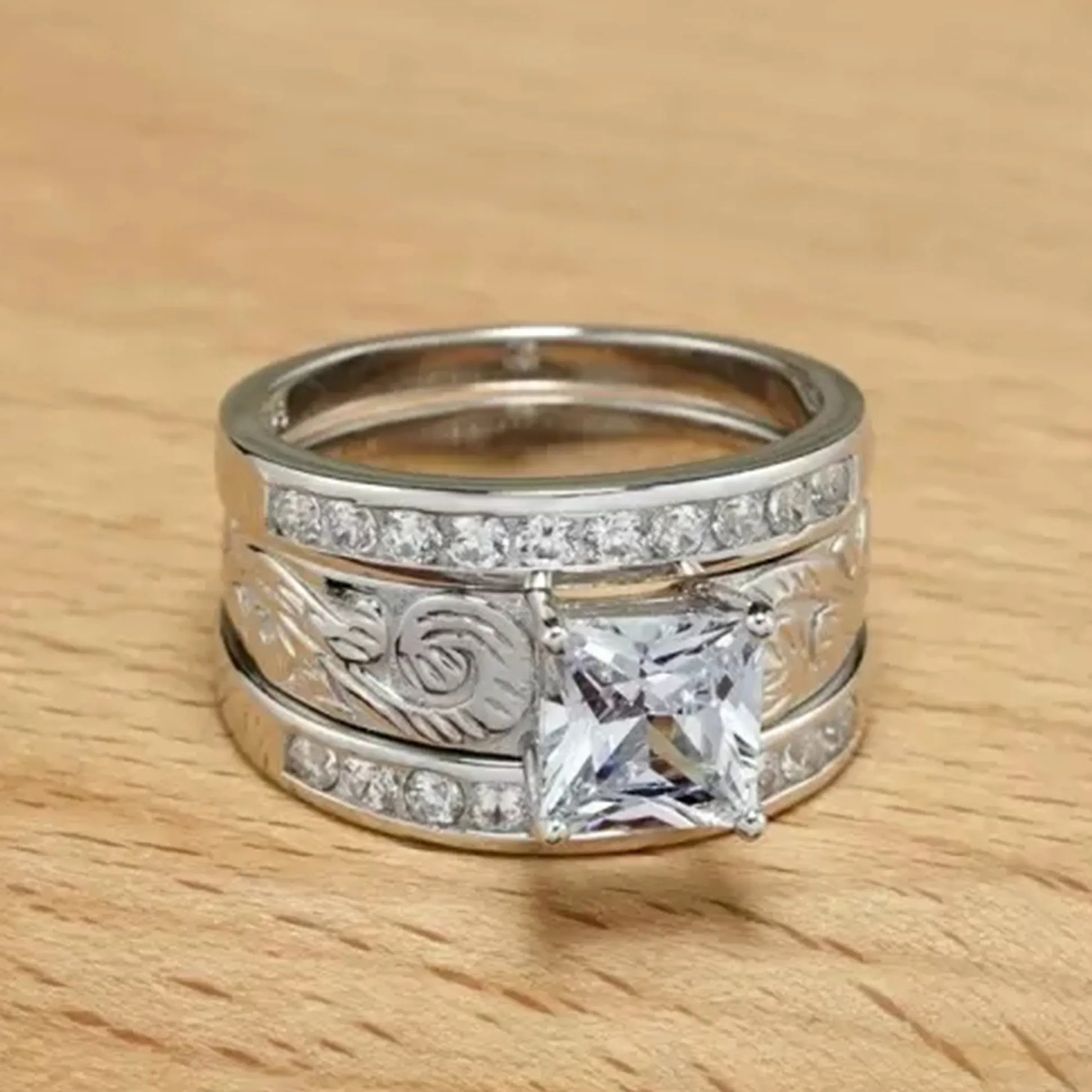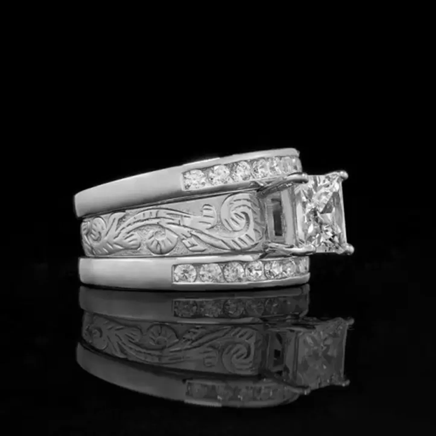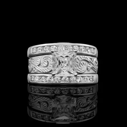 Product Introduction: This elegant ring set, model Q079, features a stunning princess-cut central stone surrounded by intricate detailing and accent diamonds. Crafted with precision, it combines timeless design with modern sophistication, making it an ideal choice for engagement or wedding purposes. Core Features: Reasons to Purchase: