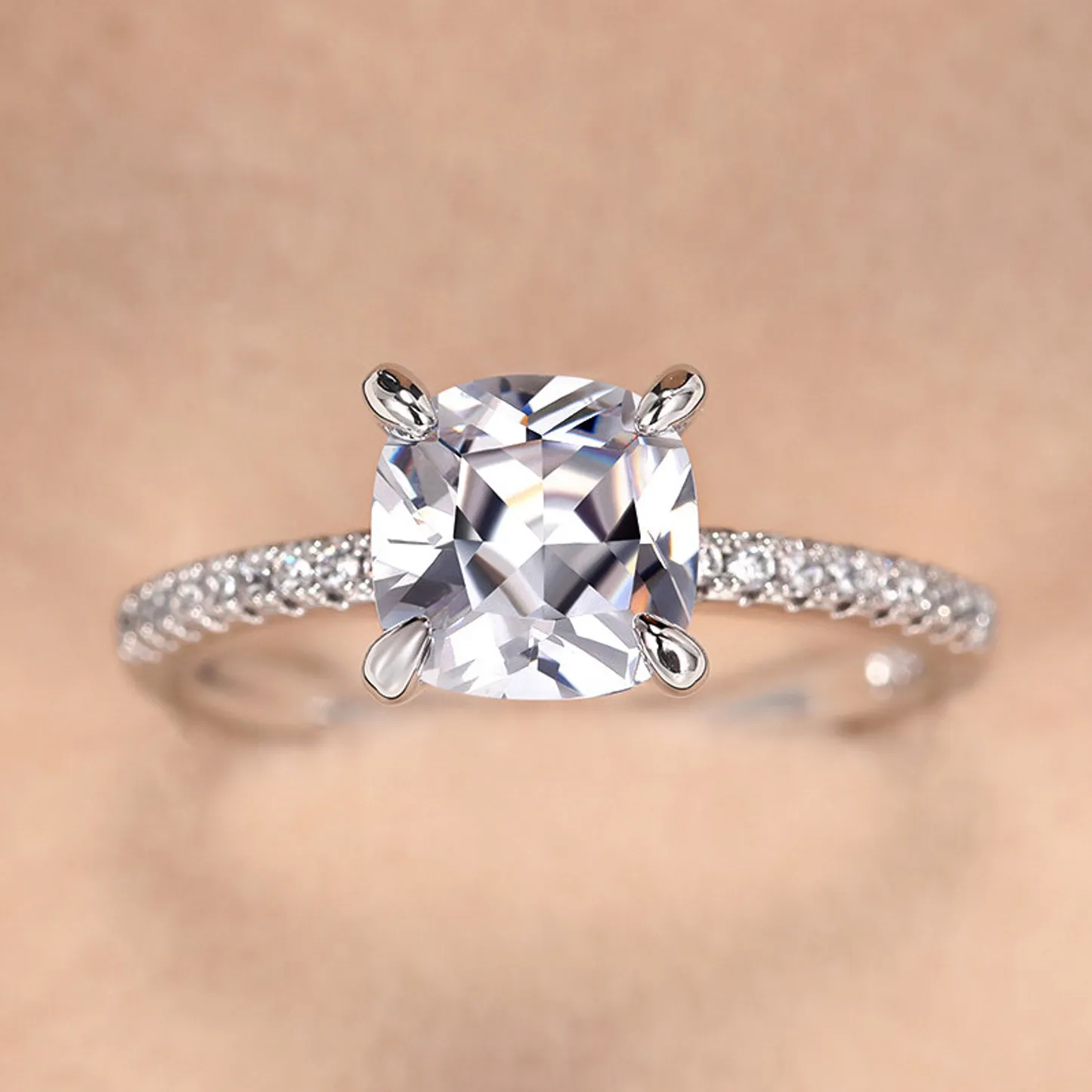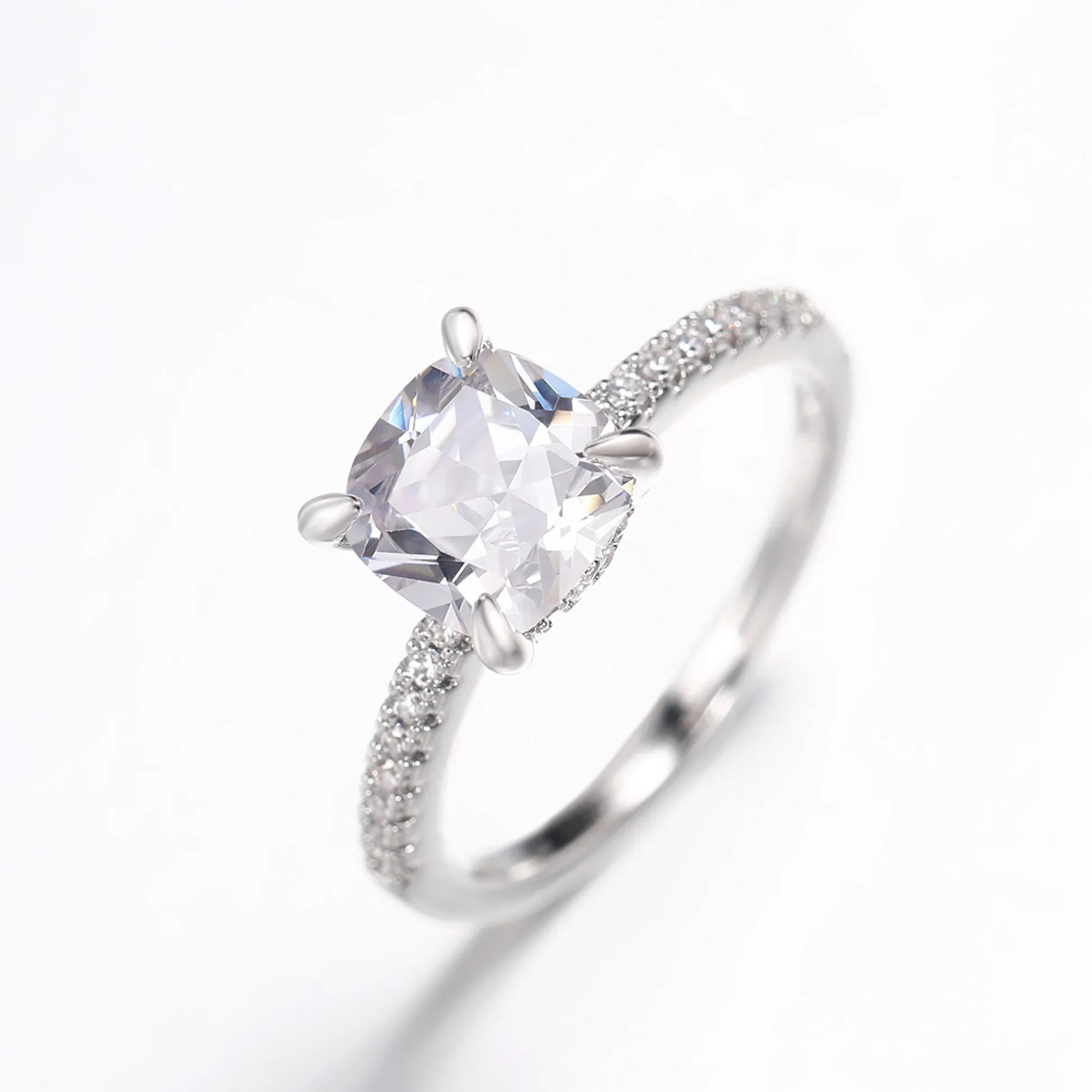 Product Introduction: The F1814 ring features a stunning cushion-cut center stone, exquisitely set in a classic four-prong setting with a delicate halo of pave-set diamonds encircling the center. Crafted to highlight brilliance and timeless elegance, this ring is designed for those who appreciate refined details and sophisticated style. Core Features: Why Choose This Ring:F1814 - Elegant Cushion Cut Diamond Ring