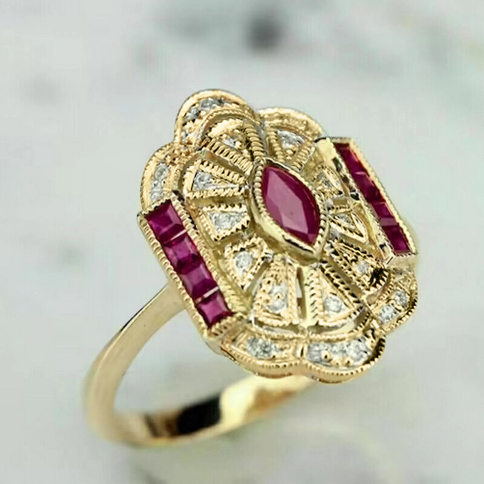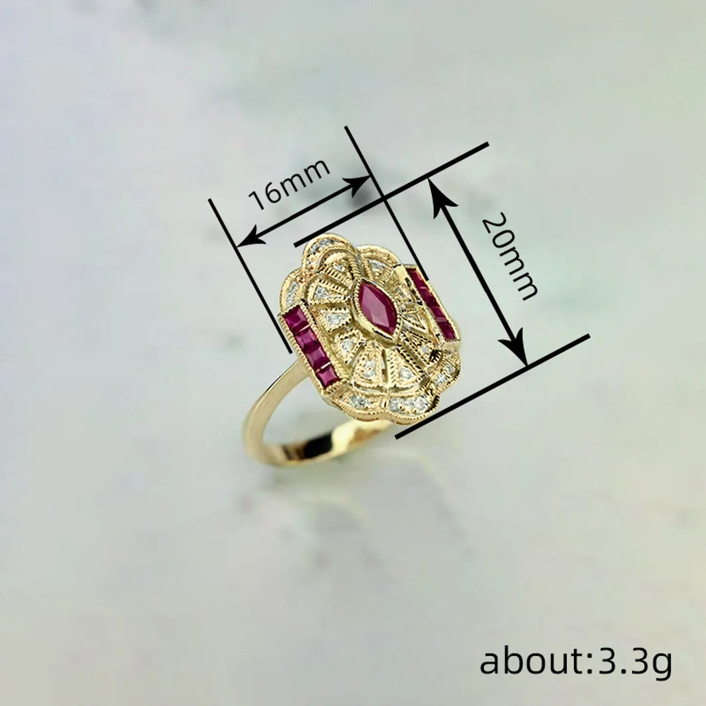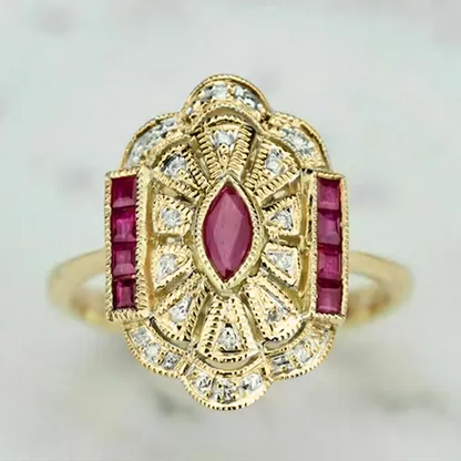 Product Introduction: This exquisite ring showcases a stunning blend of craftsmanship and elegance, featuring a central marquise-cut ruby surrounded by a radiant halo of sparkling diamonds. Crafted in a luxurious gold setting, the design is further enhanced with vertical rows of vibrant red gemstones on either side, creating a symmetrical and regal appearance. The intricate filigree detailing adds depth and sophistication, making this piece ideal for those who appreciate timeless fine jewelry. Core Features: Reasons to Purchase: