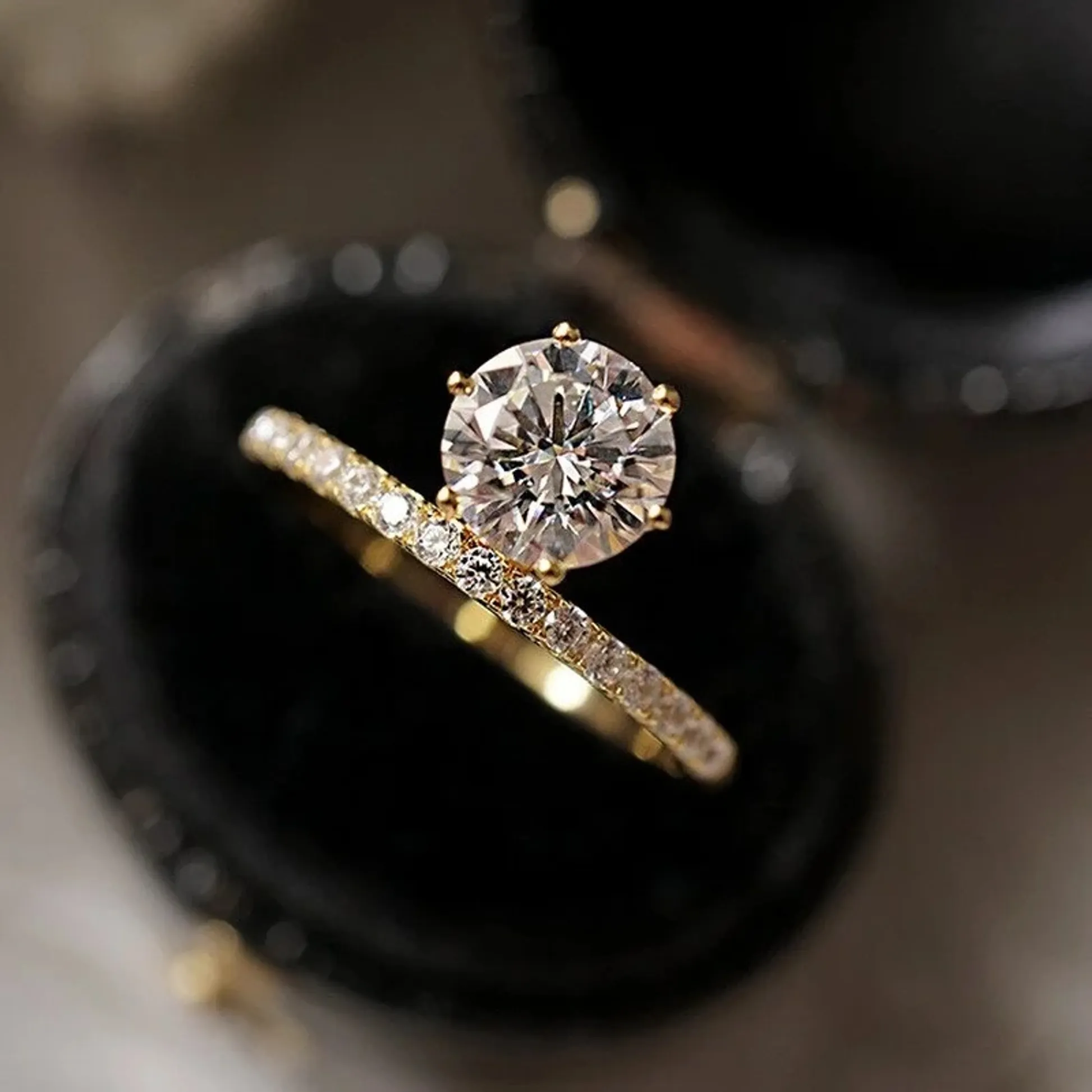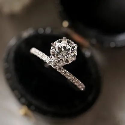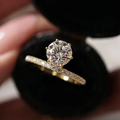 Product Introduction: This elegant engagement ring features a stunning round-cut center stone, meticulously set in a secure four-prong setting to maximize brilliance and light reflection. Crafted with precision, the band is adorned with a delicate pavé of small diamonds, adding subtle sparkle and sophistication to every angle. The ring is presented in a luxurious black velvet box, highlighting its refined beauty and making it an ideal choice for timeless expressions of love. Core Features: Reasons to Choose This Ring: