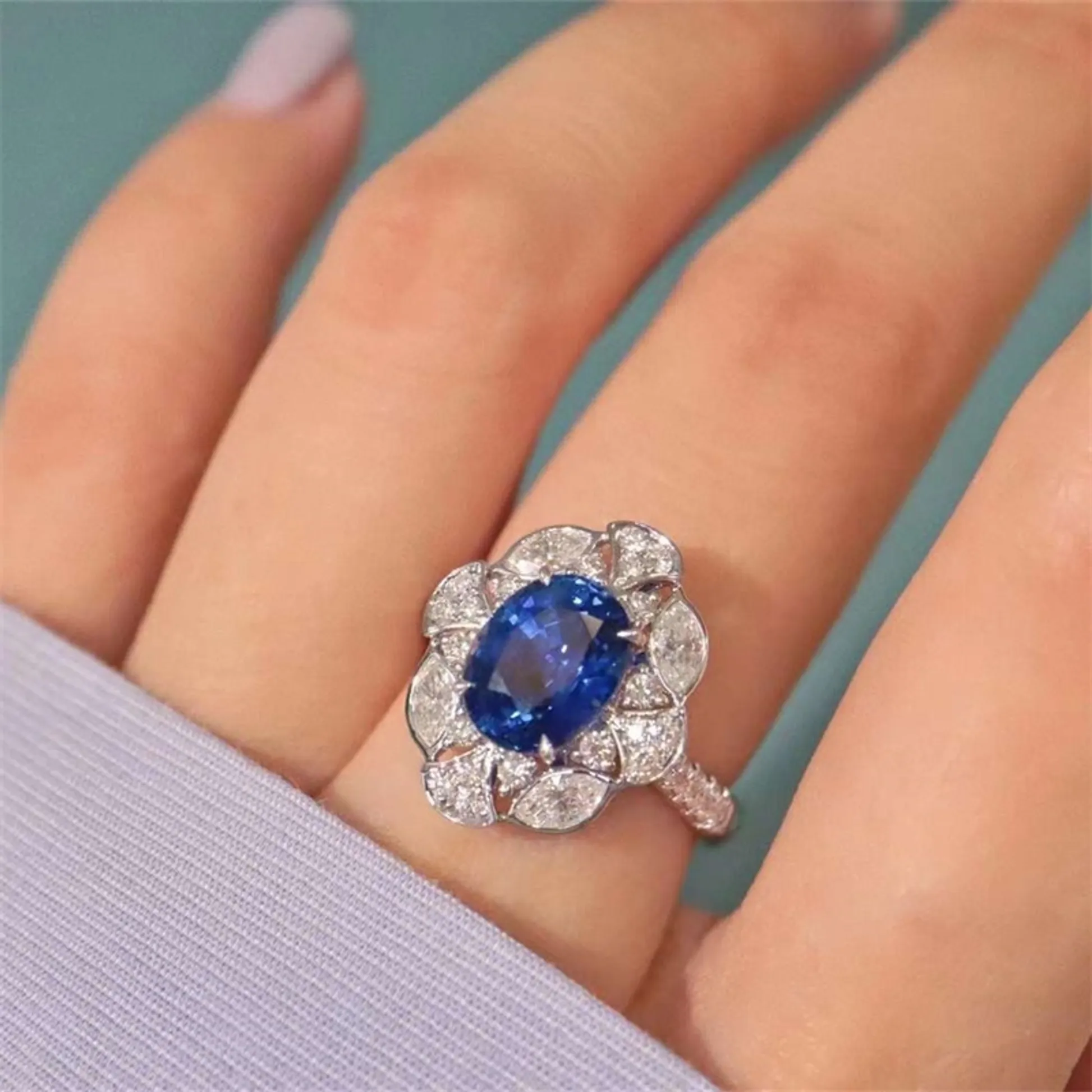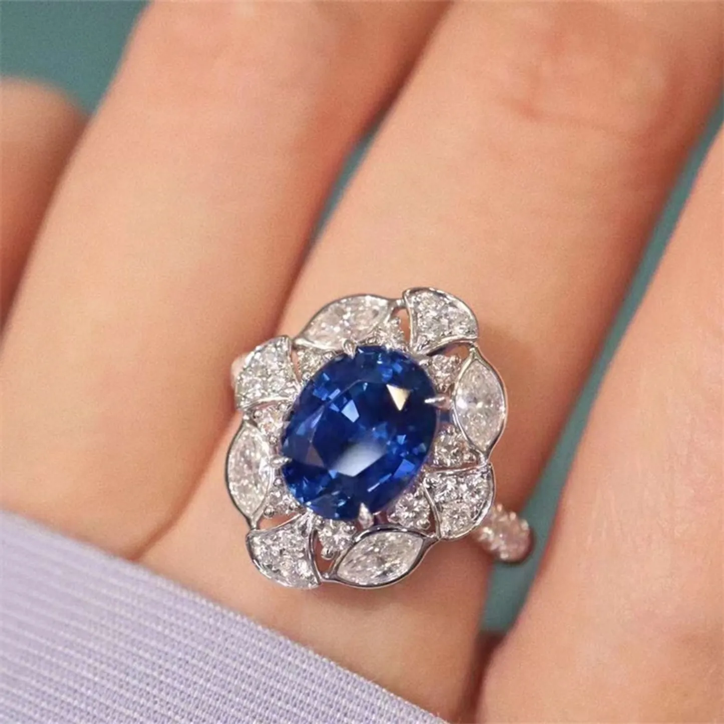 Product Introduction: This exquisite ring features a stunning oval-cut blue sapphire as its centerpiece, surrounded by a halo of meticulously set diamonds in a floral-inspired design. Crafted with precision and elegance, the piece showcases a harmonious blend of rich color and brilliance, making it a timeless addition to any fine jewelry collection. Core Features: Reasons to Purchase: