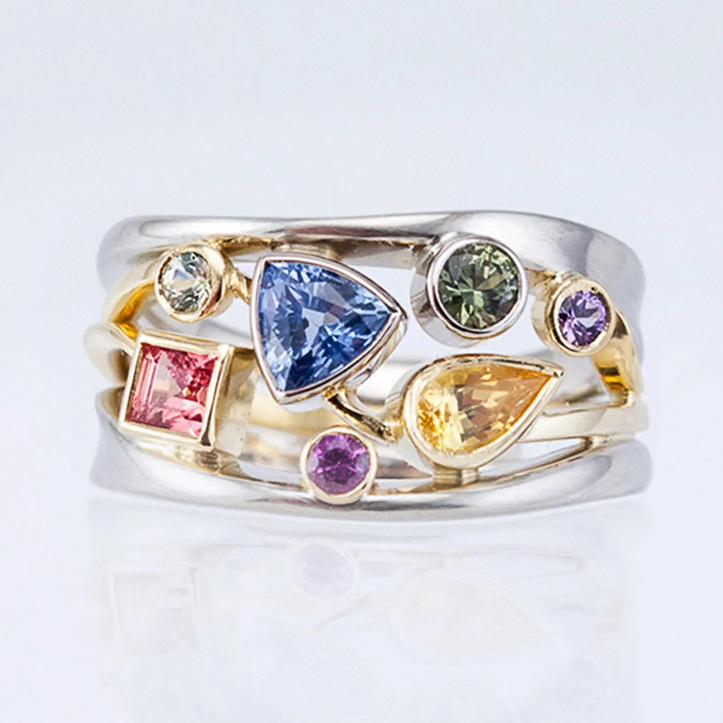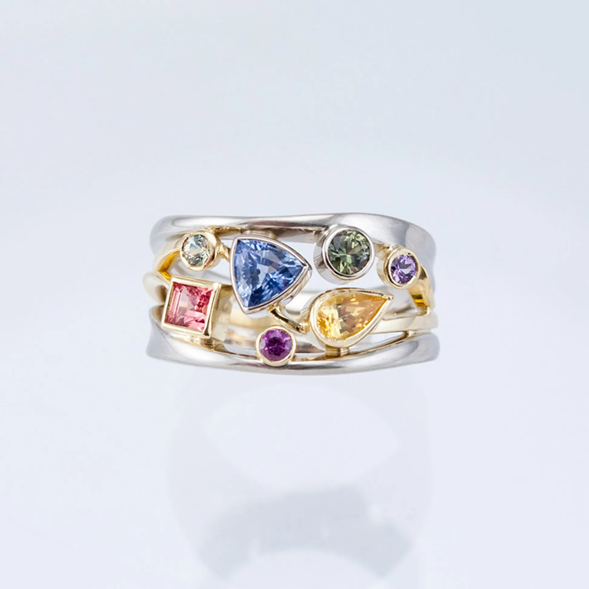 Product Introduction: This elegant ring, model F301, showcases a stunning multi-stone design crafted with precision and artistry. Featuring a harmonious blend of colorful gemstones set in a dual-tone metal band, it combines modern aesthetics with timeless elegance. The ring is designed to make a bold yet refined statement, perfect for those who appreciate unique jewelry with vibrant details. Core Features: Reasons to Purchase: