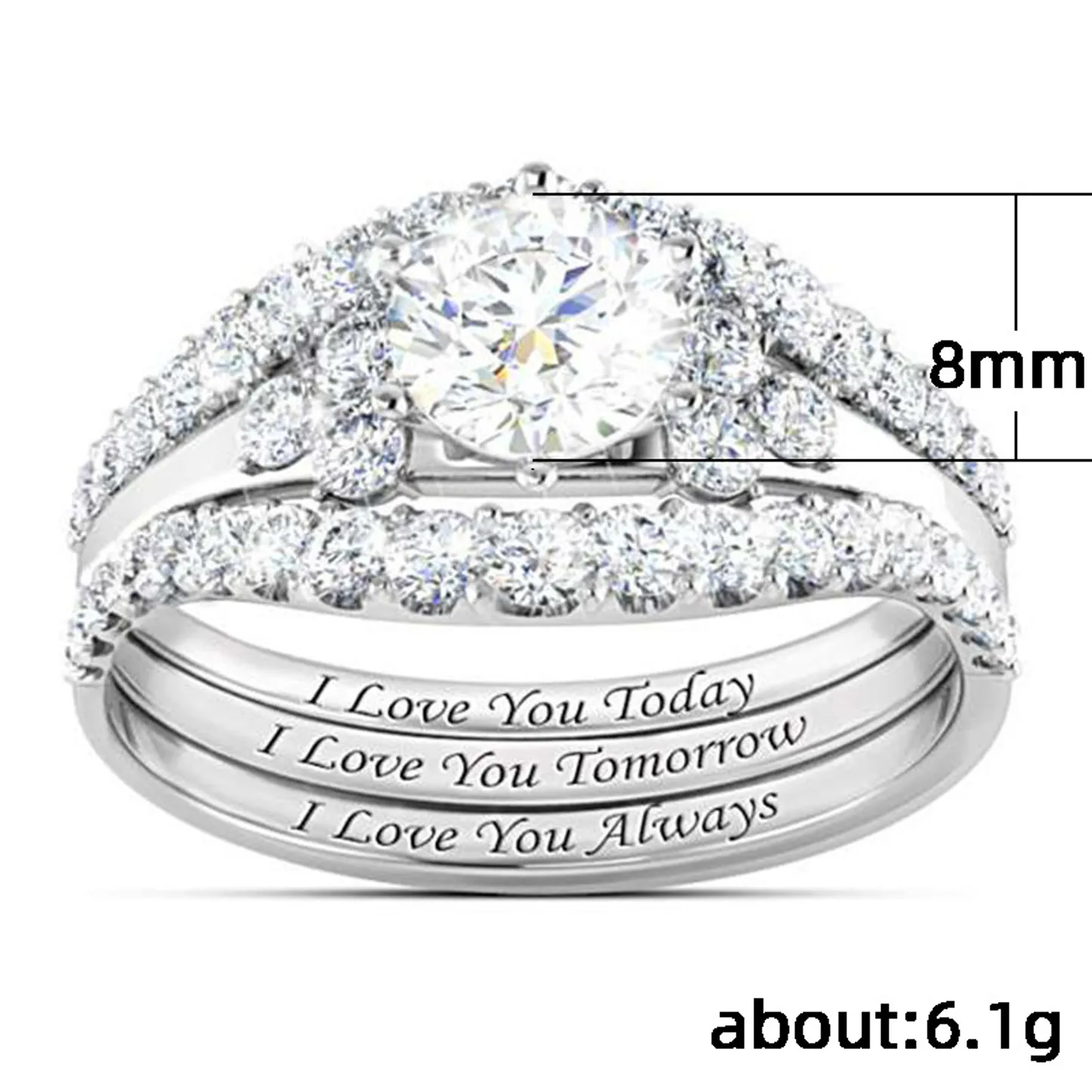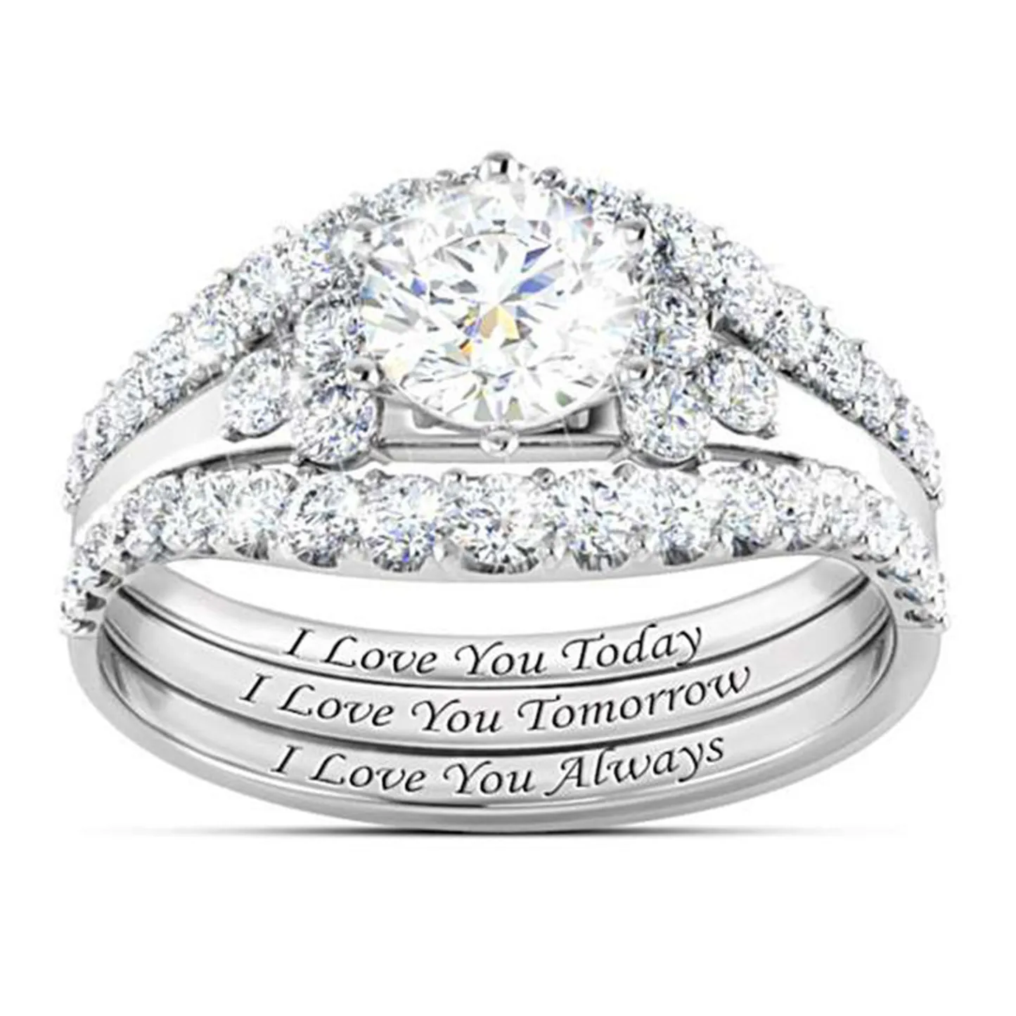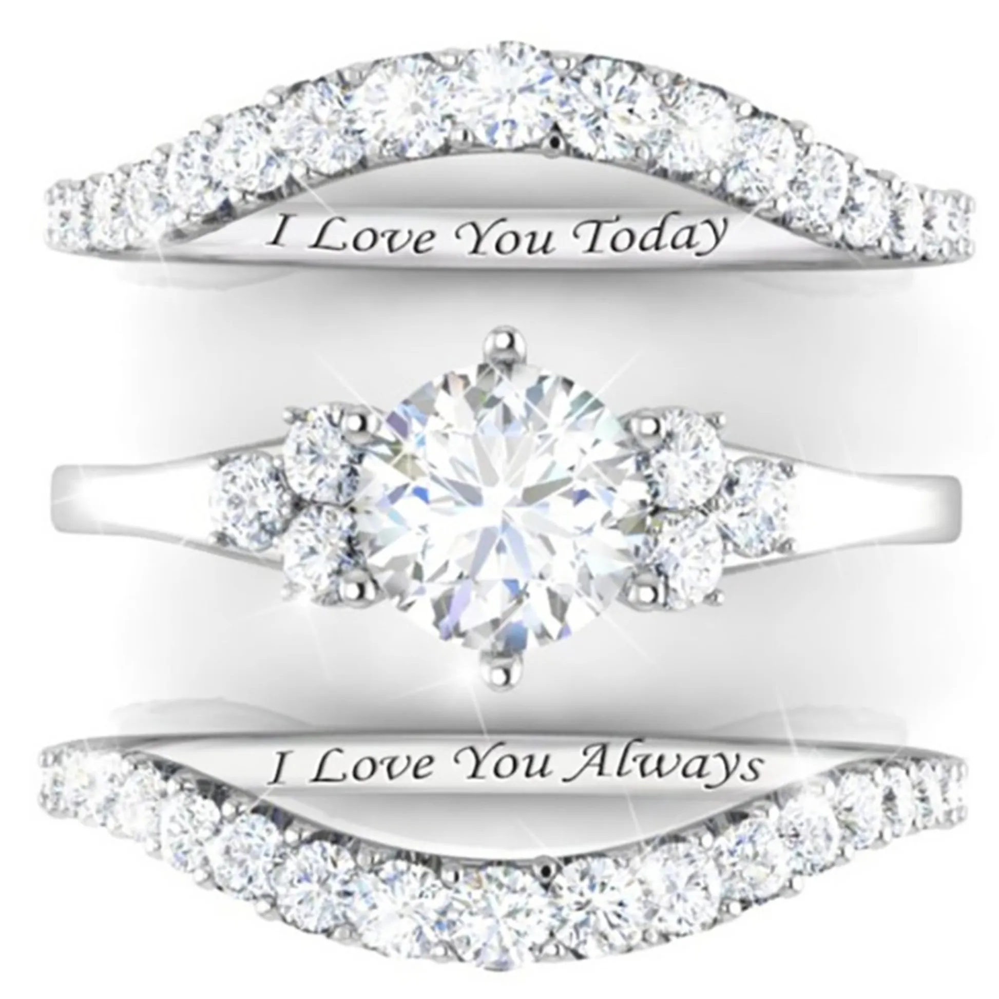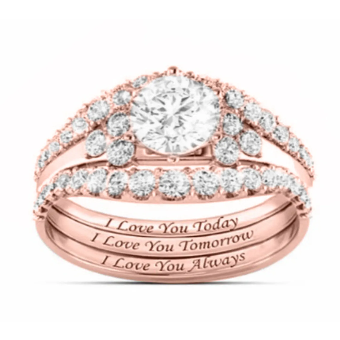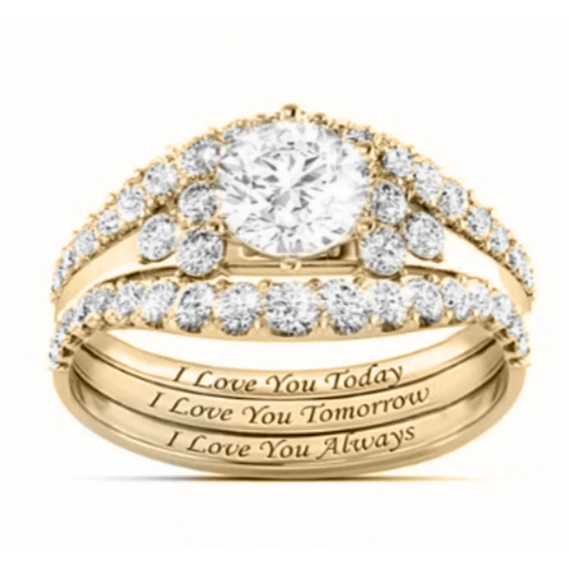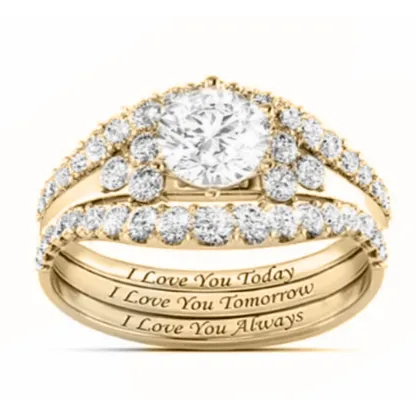 Product Introduction: The H132 engagement ring set features a stunning design with a central round-cut diamond surrounded by a halo of smaller diamonds, creating a radiant and timeless appearance. Available in three elegant finishes—white gold, yellow gold, and rose gold—the rings are crafted to suit diverse tastes and styles. The matching band is delicately engraved with the heartfelt message: "I Love You Today, I Love You Tomorrow, I Love You Always," adding a personal touch to this romantic jewelry piece. Core Features: Why Choose This Product: This ring set combines elegance, sentiment, and quality craftsmanship, making it an ideal choice for engagement or anniversary gifts. Its classic design ensures timeless appeal, while the engraved message adds emotional depth. Suitable for formal occasions or everyday wear, it symbolizes enduring commitment and love.H132 Elegant Diamond Engagement Ring Set with Engraved Love Message