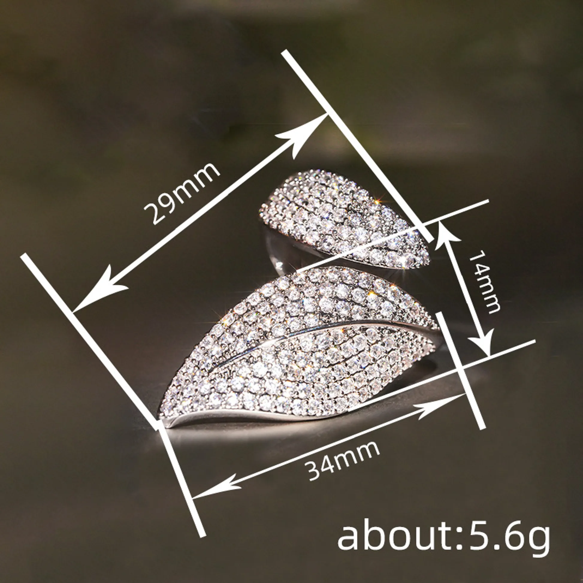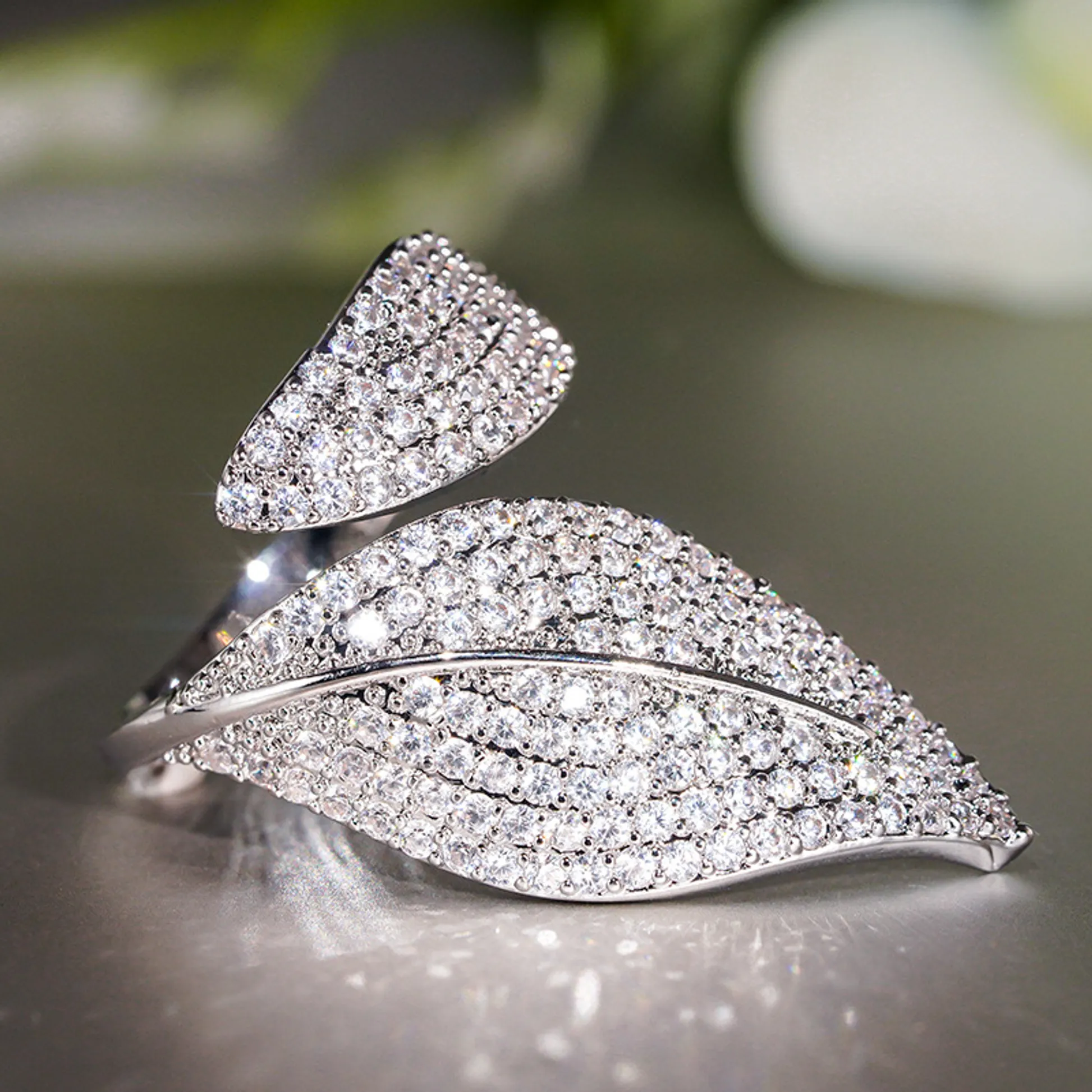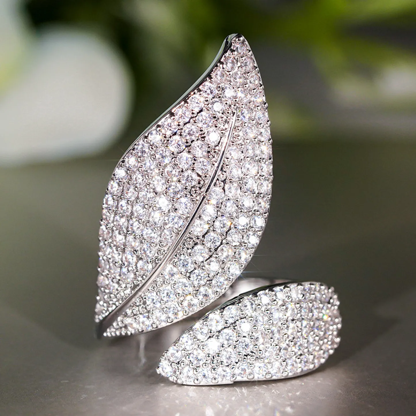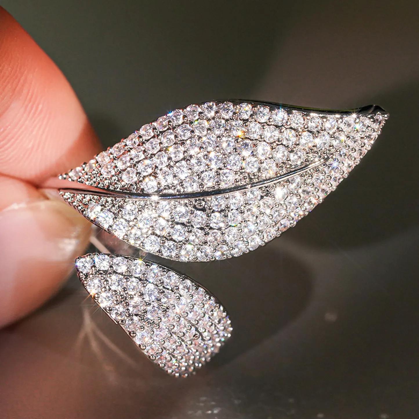 Product Introduction: This exquisite A133 ring features a sophisticated leaf-inspired design, meticulously crafted to embody nature's elegance. Adorned with sparkling crystals arranged in a dense pavé setting, the ring captures light beautifully, creating a dazzling effect suitable for both formal occasions and everyday wear. The adjustable band ensures a comfortable fit for various finger sizes, enhancing its versatility. Core Features: Why Choose This Product: The A133 ring combines timeless beauty with modern design, making it a perfect choice for those seeking a touch of sophistication. Its adjustable size enhances usability, while the crystal embellishments offer lasting shine. Ideal as a gift or personal adornment, this piece adds a refined accent to any ensemble.A133 - Elegant Crystal Leaf Design Ring