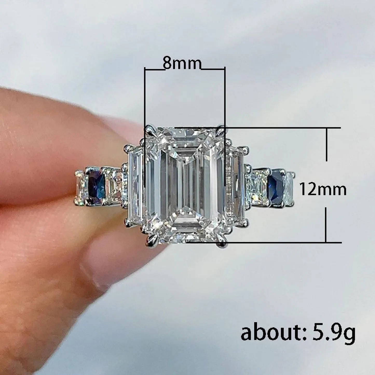 Product Introduction: This elegant engagement ring features a stunning emerald-cut center stone, meticulously set in a four-prong setting to maximize brilliance and light reflection. Flanked by two vibrant blue sapphire side stones and accent diamonds, the design combines timeless sophistication with modern flair. Crafted from high-quality metal, this ring is ideal for those seeking a unique and luxurious piece of jewelry. Core Features: Reasons to Purchase: