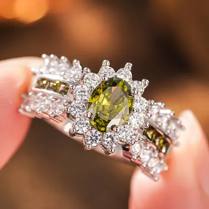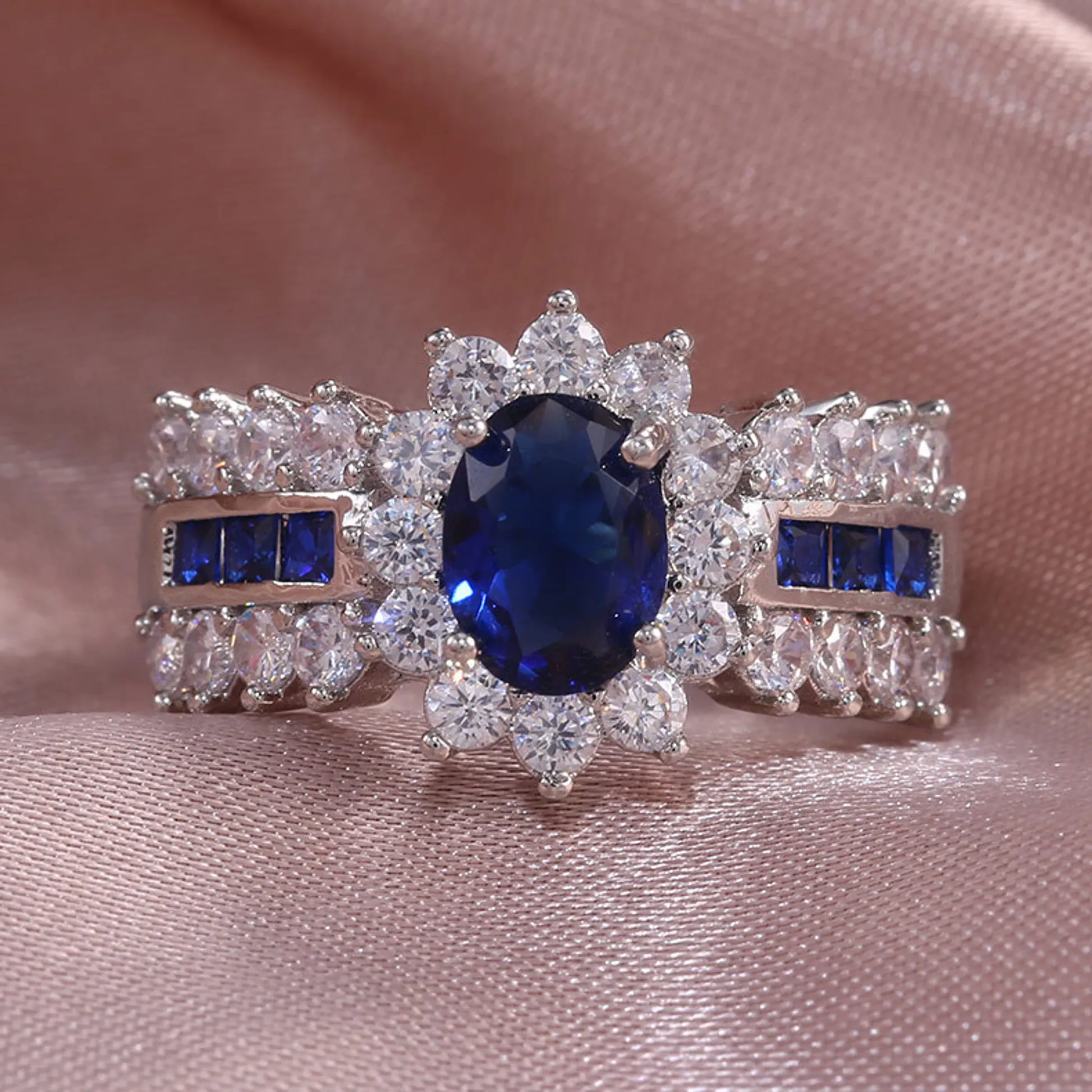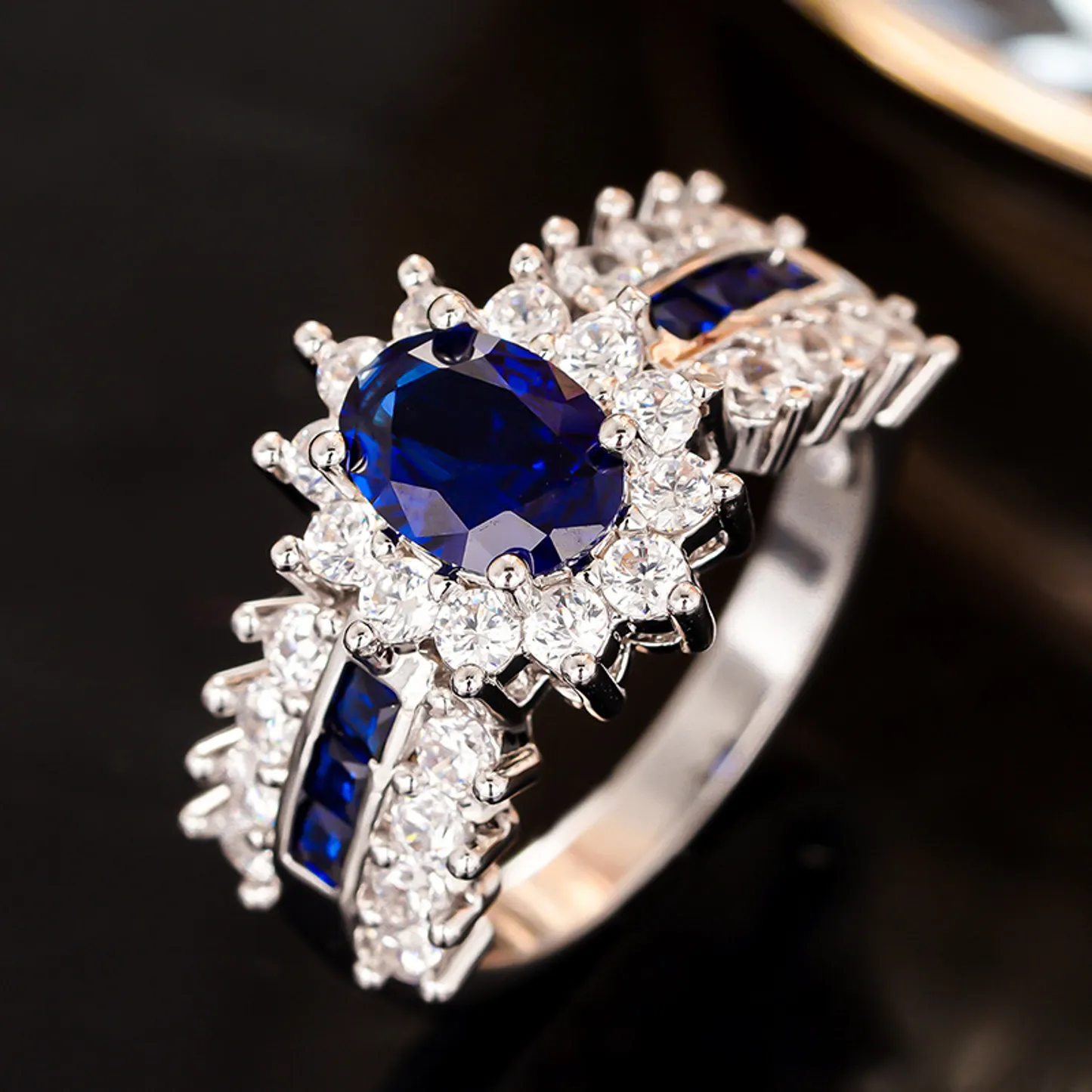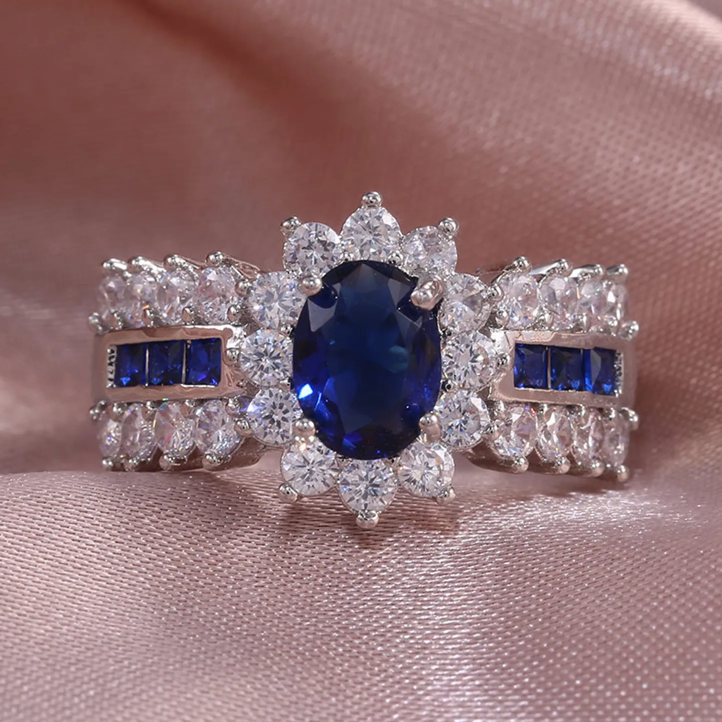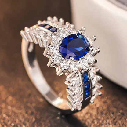 Product Introduction: This exquisite ring features a stunning oval-cut blue sapphire as the centerpiece, surrounded by a halo of sparkling clear gemstones. Crafted with precision, the design showcases a luxurious blend of elegance and sophistication, making it an ideal choice for special occasions or as a timeless addition to any jewelry collection. Core Features: Reasons to Buy:Elegant Blue Sapphire Ring with Diamond Accents