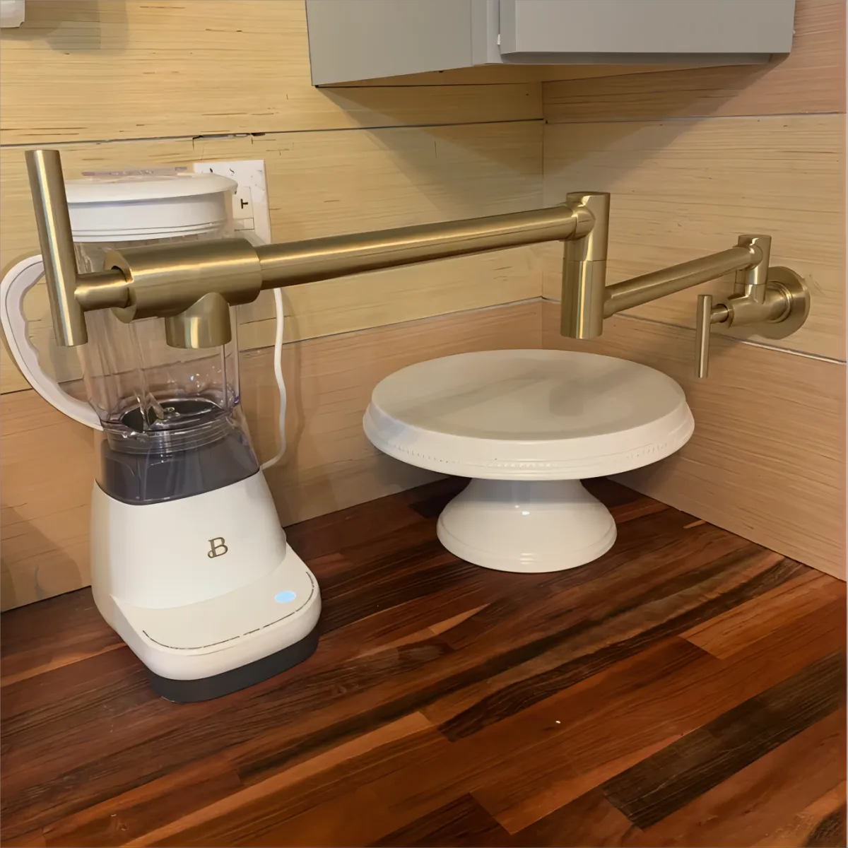 5.Brushed gold pot filler with dual handles for easy operation.