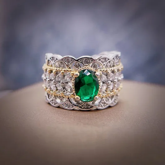 Q731 Women's 925 Silver Cocktail Ring Emerald Oval Cut Pave Setting Flower Pattern Wedding Fine Ring