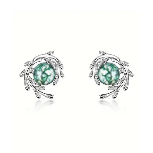 Elegant White Gold Stud Earrings With Green Natural Stone Bezel Setting Plant Design Romantic Women's Fashion Jewelry