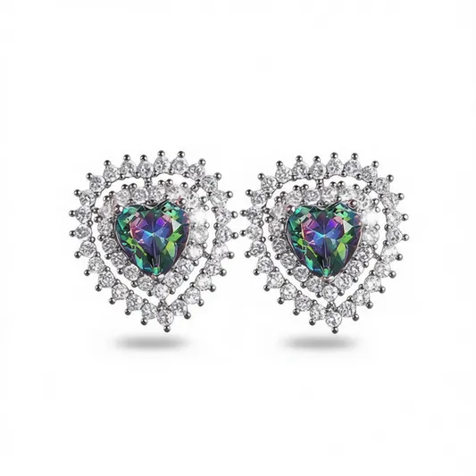 Green Romantic Heart Stud Earrings 925 Silver Rainbow Quartz Crystal Rhinestone Claw Setting Women's Party Jewelry