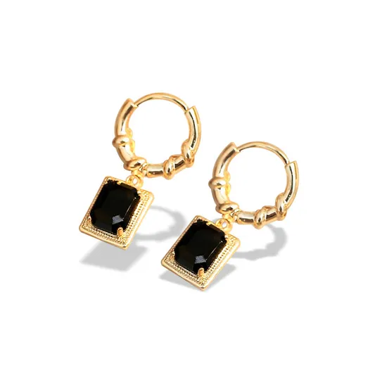 Golden Hoop Earrings With Black Emerald Cut Crystal Rhinestone Bezel Setting Geometric Classic Style For Women
