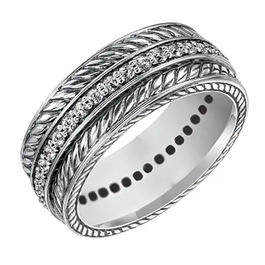 F289 925 Silver Wedding Band Ring With Round Diamond Channel Setting Plant Pattern Unisex Fine Jewelry